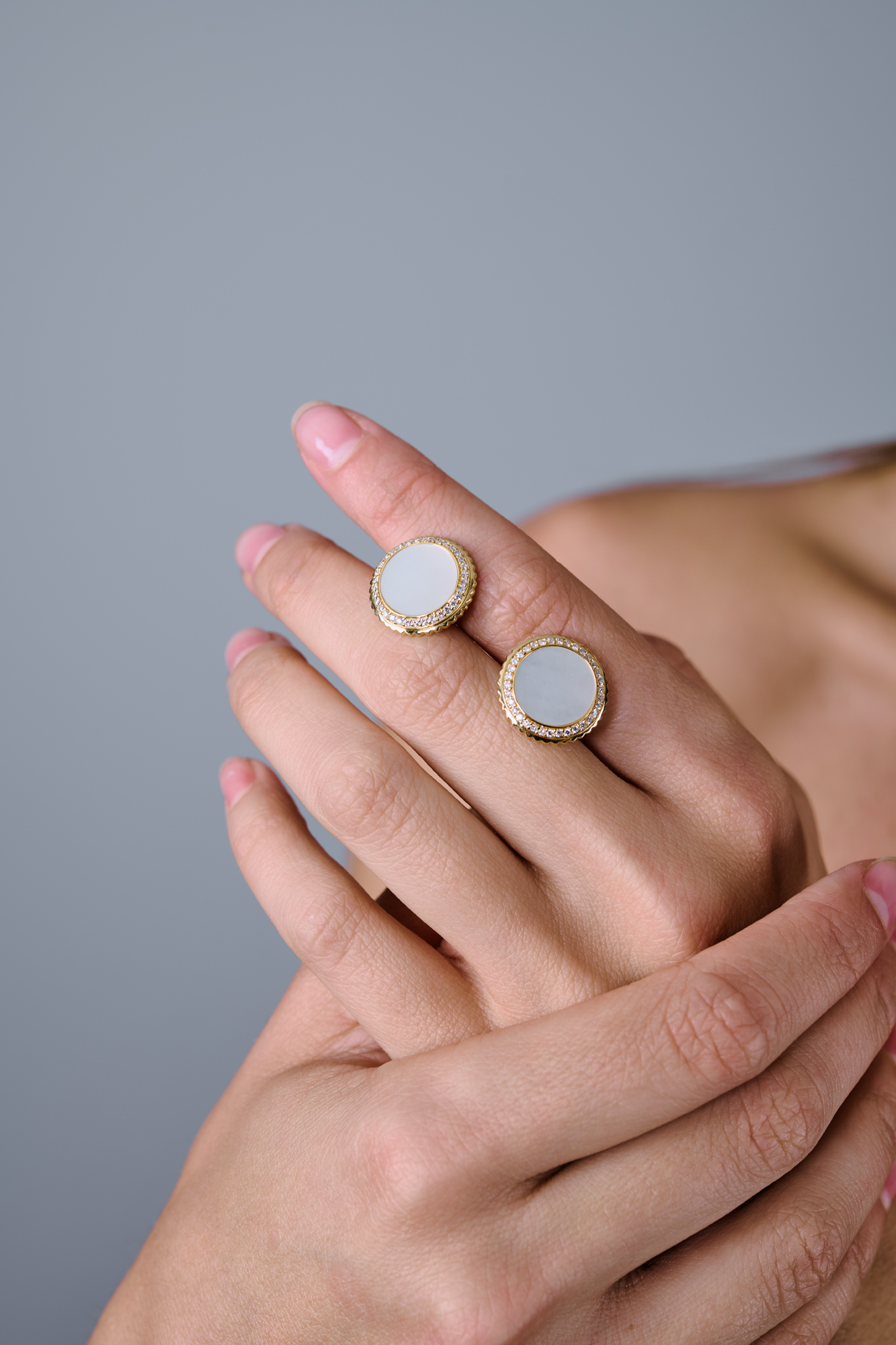 Запонки выполненные из желтого золота 750 пробы с вставкой из перламутра и паве из бриллиантов классической формы огранки. Диаметр 16 мм. Вес - 13,14 гр.