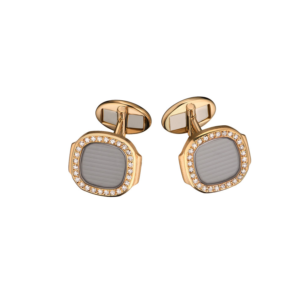 Запонки Patek Philippe из коллекции Nautilus выполненные из желтого золота 750 пробы с вставкой из серого кристалла сапфира по центру, с 64 бриллиантами классической формы огранки общей массой 1,00 ct. Размер 14,5 х 16 мм. Вес - 17,57 гр. Подарочный вариант!