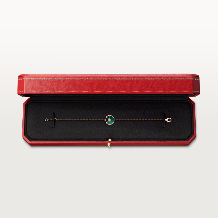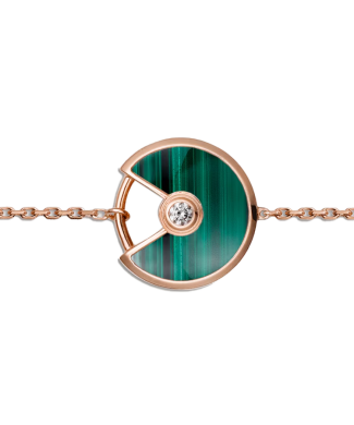 Браслет Cartier коллекции "Amulette de Cartier" выполнена из розового золота 750 пробы и малахитом. 1 бриллиант классической формы огранки массой 0,02 ct. Диаметр кулона 12 мм. Размер браслета 17 см. Вес - 2,18 гр.