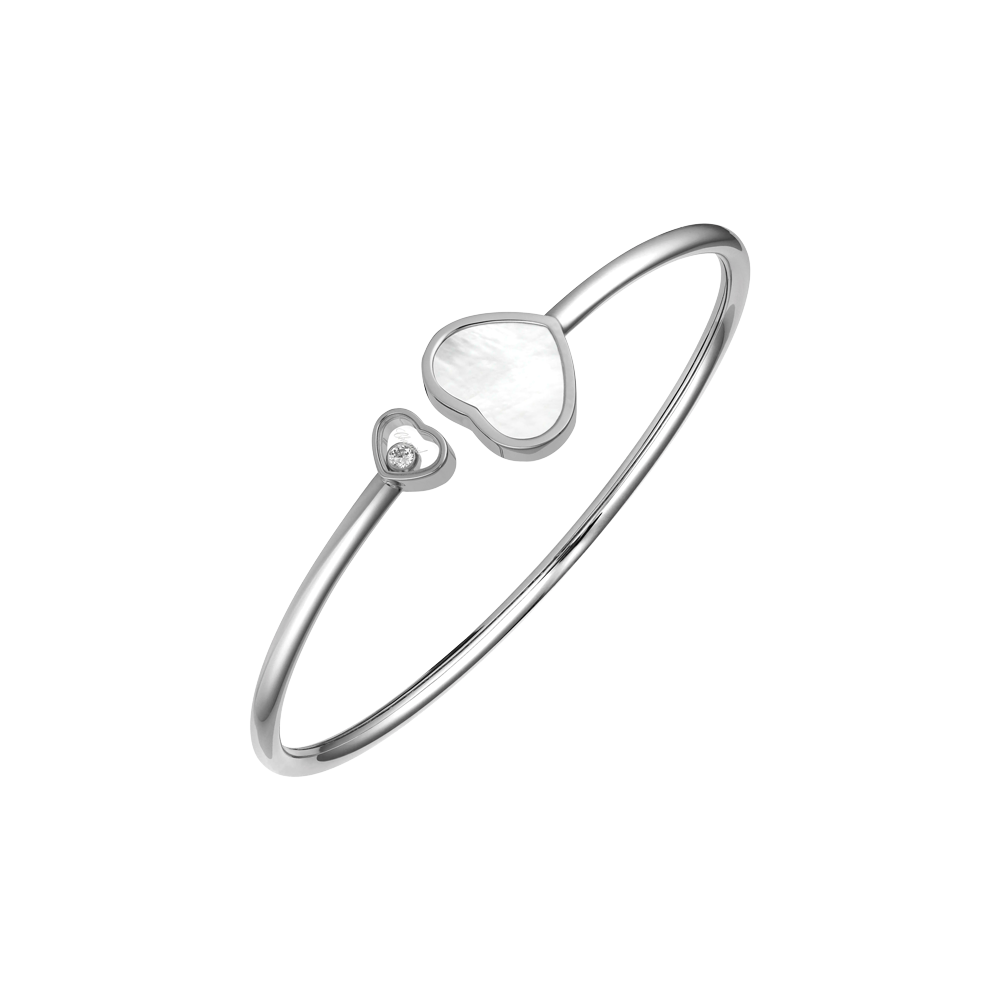 Браслет Chopard коллекции "Happy Hearts" выполнен из белого золота 750 пробы. 1 плавающий бриллиант массой 0,05 ct. Вставка - перламутр. Размер - 17. Вес - 11,38 гр.