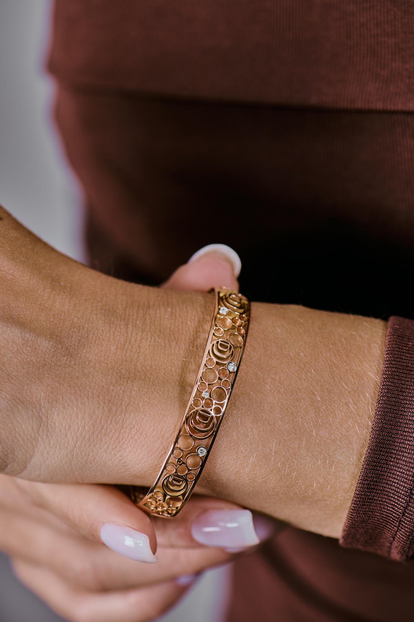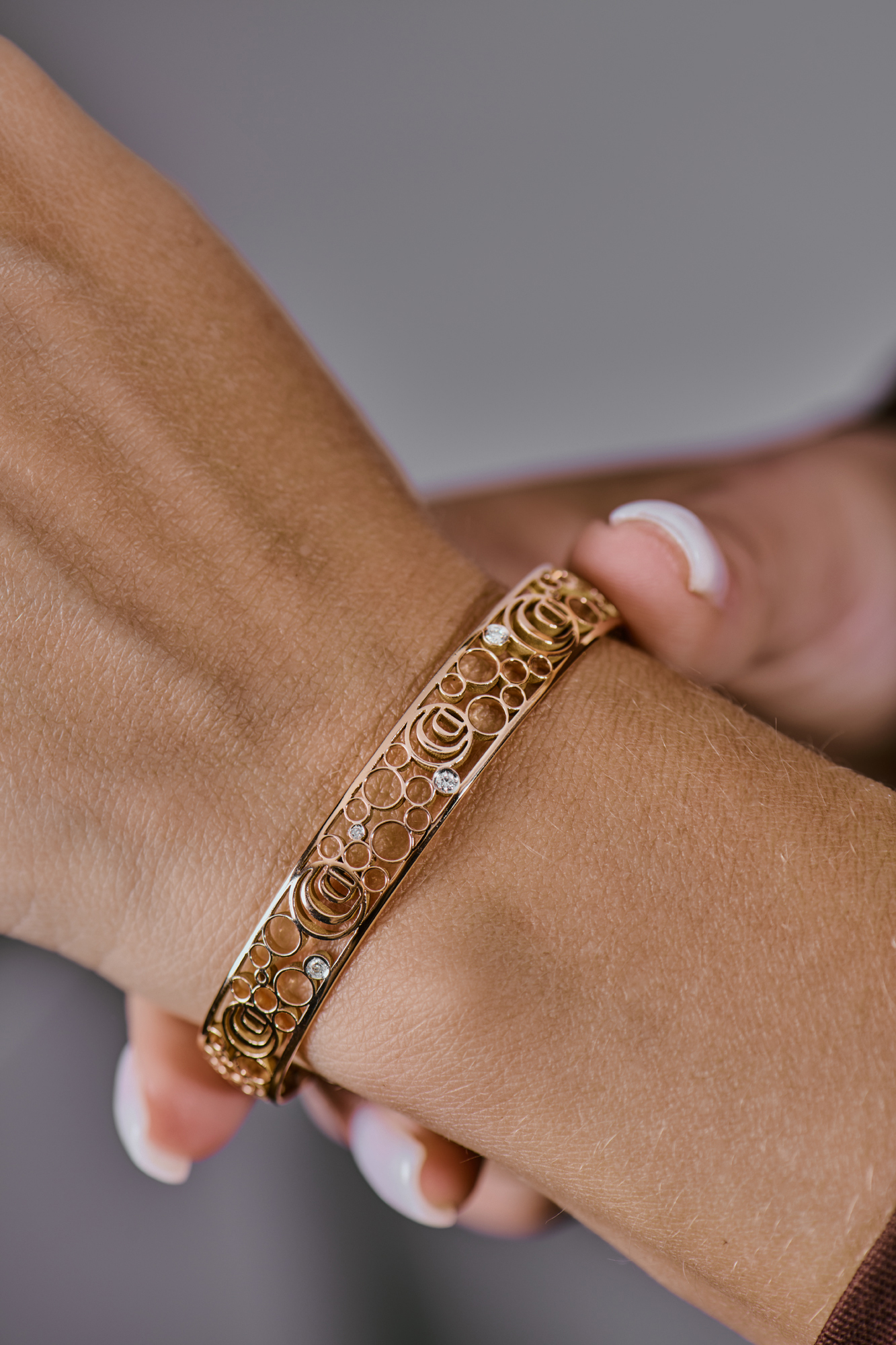 Открытый браслет Damiani коллекции "Damianissima " выполненное из розового золота 750 пробы с 4 бриллиантом классической формы огранки общей массой 0,06 сt. Размер - 17. Вес - 12,43 гр.