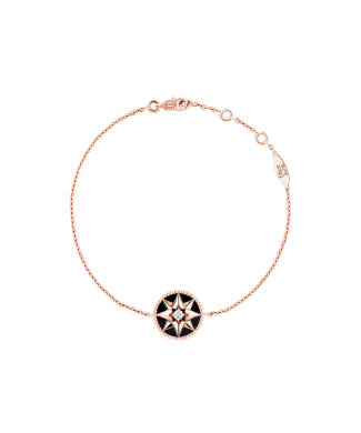 Браслет Dior коллекции "ROSE DES VENTS" выполненная из розового золота 750 пробы с вставкой из оникса и 1 бриллианта классической формы огранки массой 0,04 ct. Диаметр мотива: 12 мм. Размер браслета - 18 см с маленькими кольцами для регулировки длины цепочки 15 см или 18 см. Вес изделия - 3,18 гр.