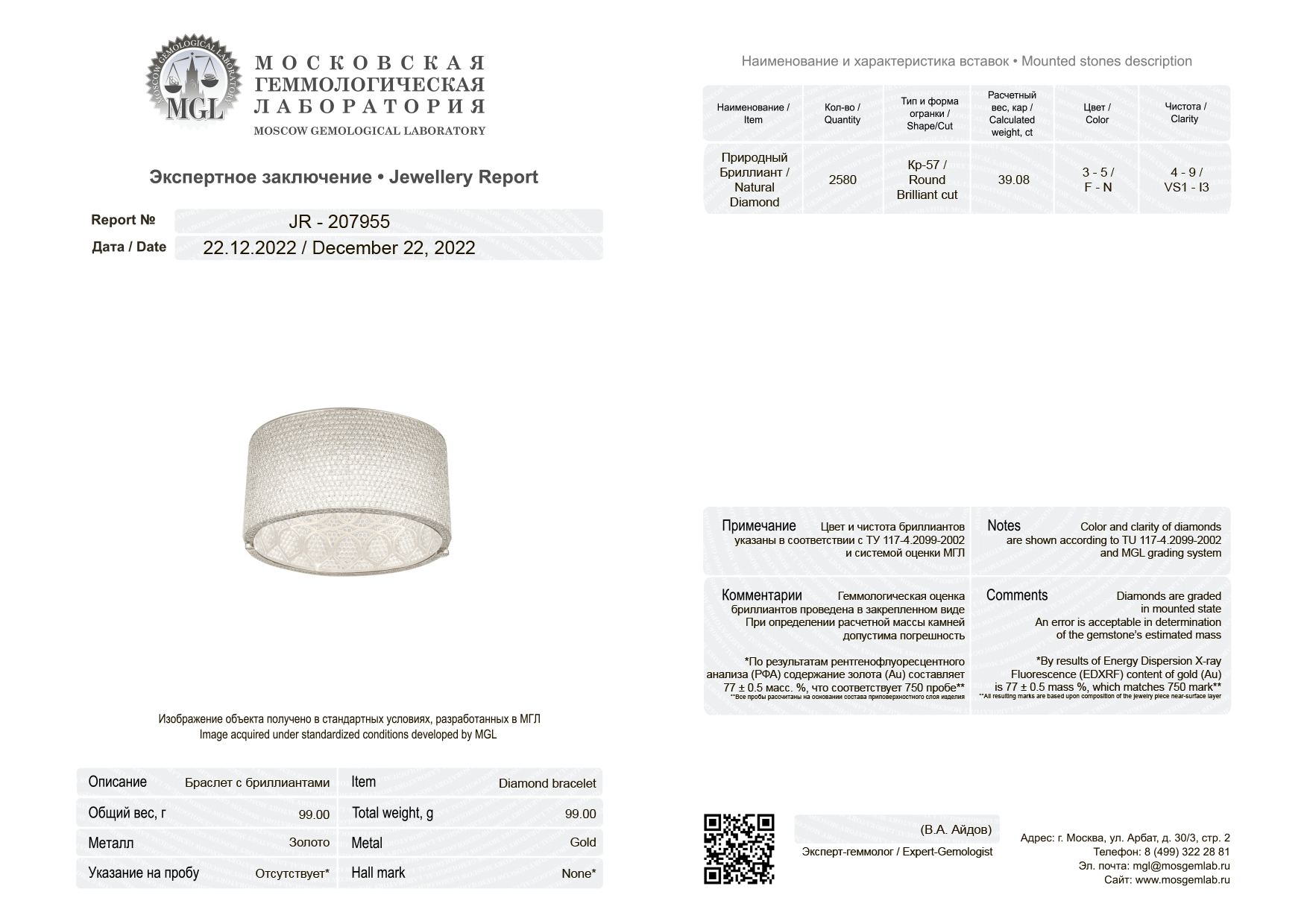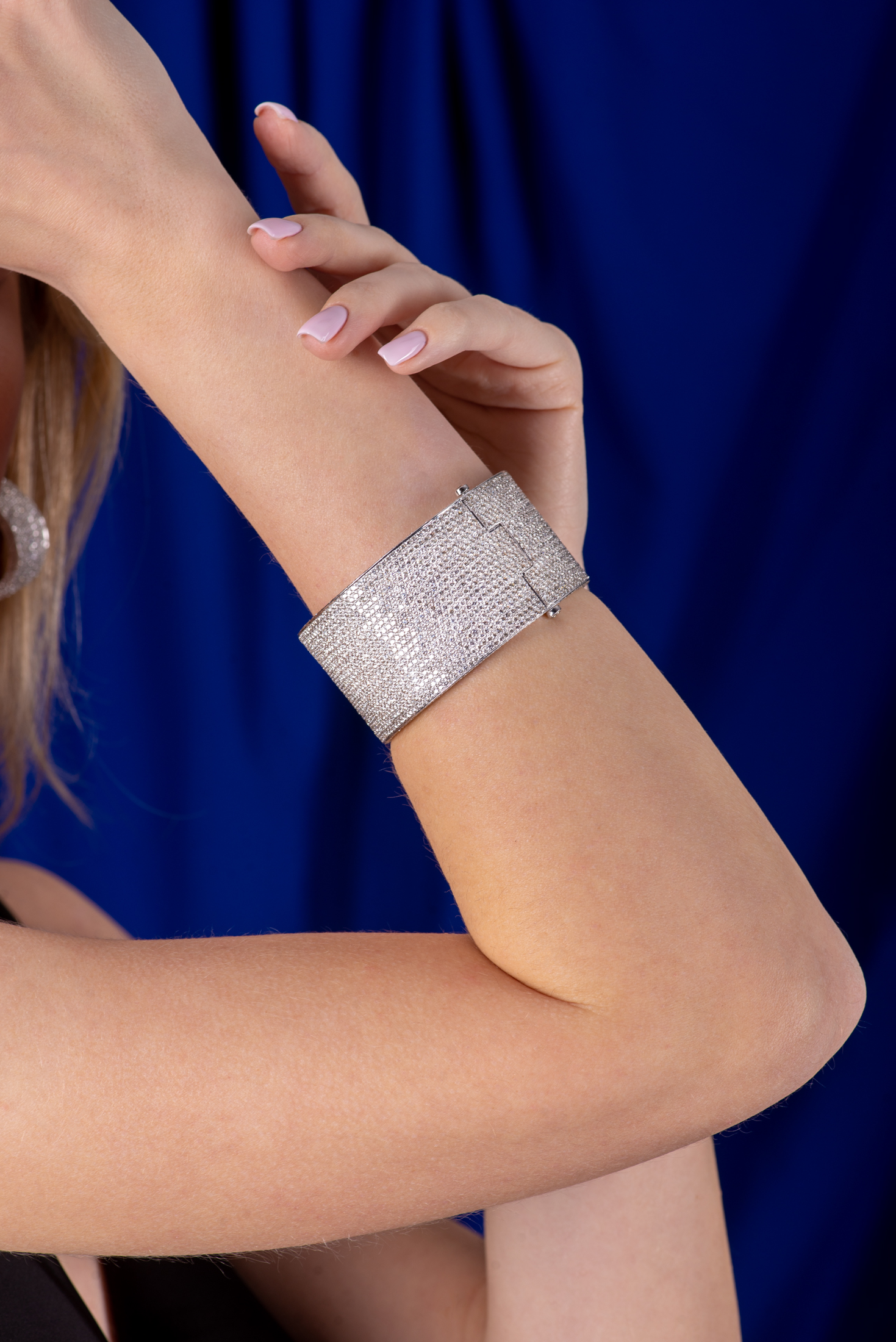 Уникальное изделие ювелирного дома Garbo, специализирующегося на индивидуальных украшениях, выполненных по заказу. Браслет из белого золота 750 пробы с 2580 бриллиантами классической формы огранки "Кр-57" общей массой 39,08 ct. Цвет бриллиантов 3-5 (F-N). Чистота бриллиантов 4-9 (VS1-I3). Диаметр браслета 18,5 см. Ширина браслета - 33 мм. Вес - 99,0 гр. В комплекте сертификат Московской геммологической лаборатории.