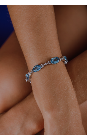 Неподвластный времени браслет H.Stern выполненный из белого золота 750 пробы с вставкой из 7 аквамаринов общей массой 24,5 ct.. а также с 56 бриллиантами классической формы огранки массой 1,65 ct., а также с 7 бриллиантами формы огранки "Маркиз" массой 0,35 ct. Длина браслета - 18,0 см. Вес - 25,47 гр.
