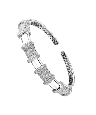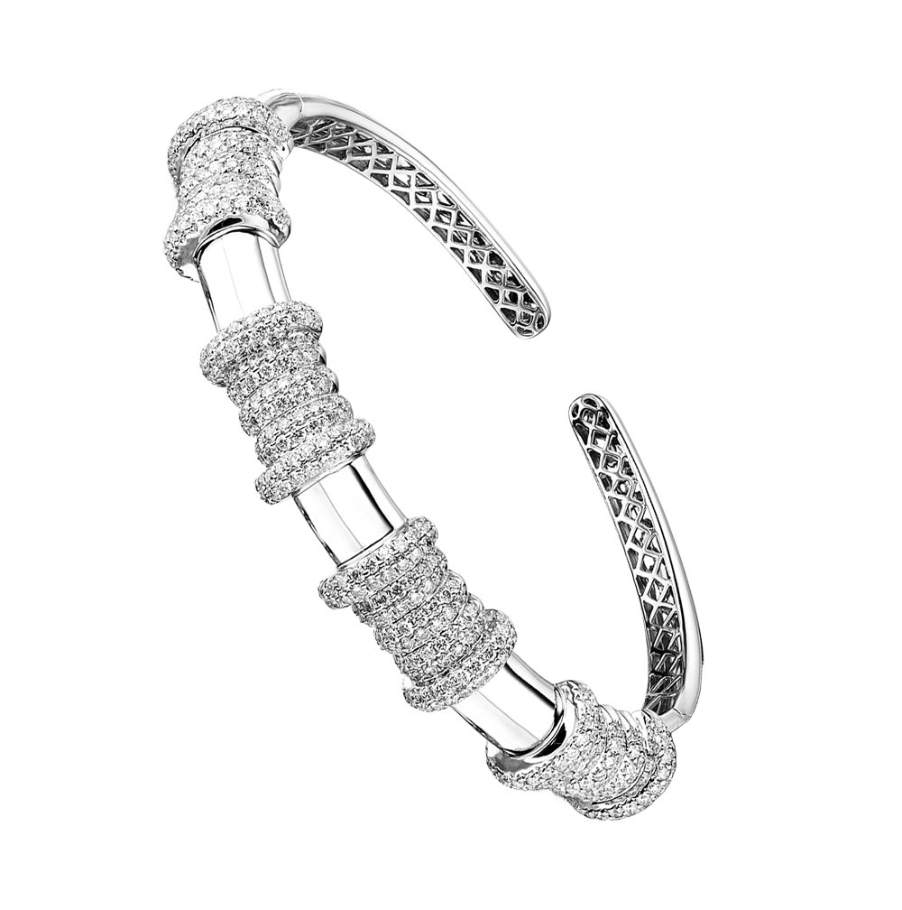 Уникальный браслет из белого золота 750 пробы с 448 бриллиантами классической формы огранки "Кр-57" общей массой 4,55 ct. Цвет бриллиантов 3 (G-H). Чистота бриллиантов 5-6 (SI1). Диаметр браслета 19,0 см. Ширина браслета - 17 мм. Вес - 26,39 гр. В комплекте сертификат Геммологического центра МГУ.
