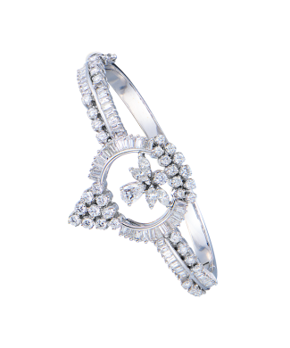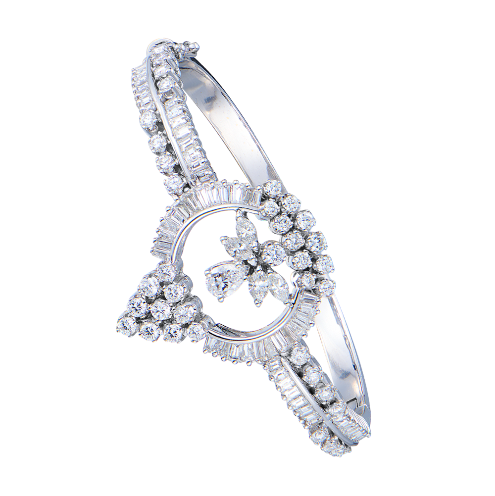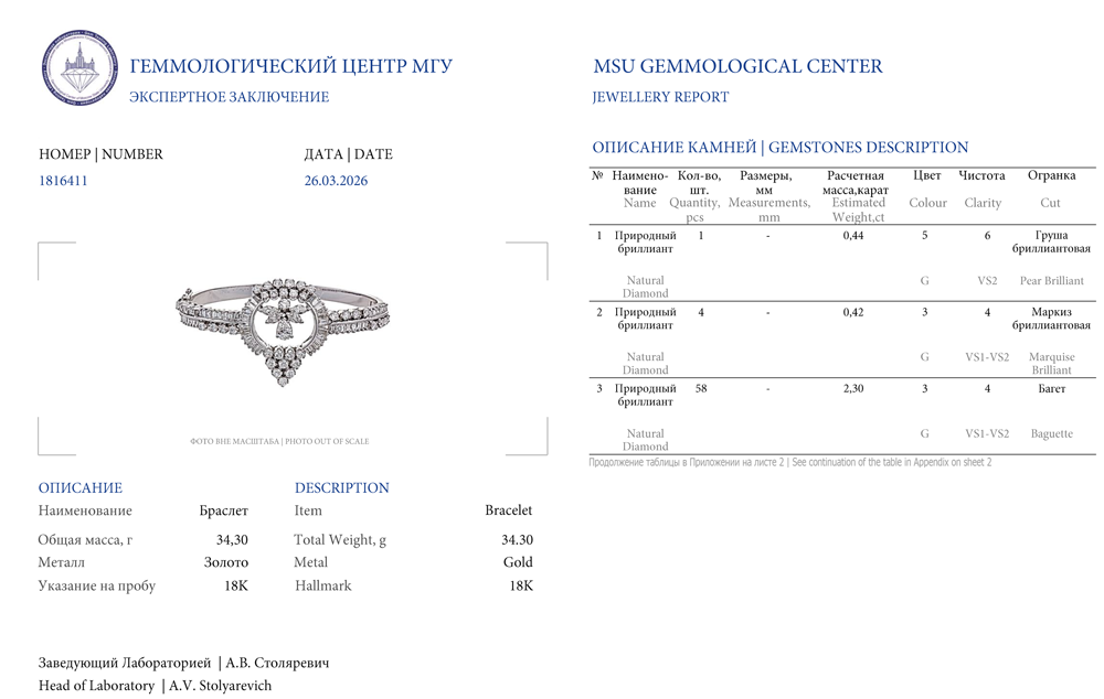 Браслет выполненный из белого золота 750 пробы с бриллиантами. 38 бриллиантов классической формы огранки общей массой 2,20 ct. Цвет 3 (G-H). Чистота 4 (VS1-VS2). 58 бриллиантов формы огранки "Багет" общей массой 2,30 ct. Цвет 3 (G). Чистота 4 (VS1-VS2). 4 бриллианта формы огранки "Маркиз" общей массой 0,42 ct. Цвет 3 (G). Чистота 4 (VS1-VS2). 1 бриллиант формы огранки "Груша" общей массой 0,45 ct. Цвет 3 (G-H). Чистота 5 (VS2). Размер 17 см. Вес - 34,30 гр. В комплекте экспертное заключение Геммологического центра МГУ.