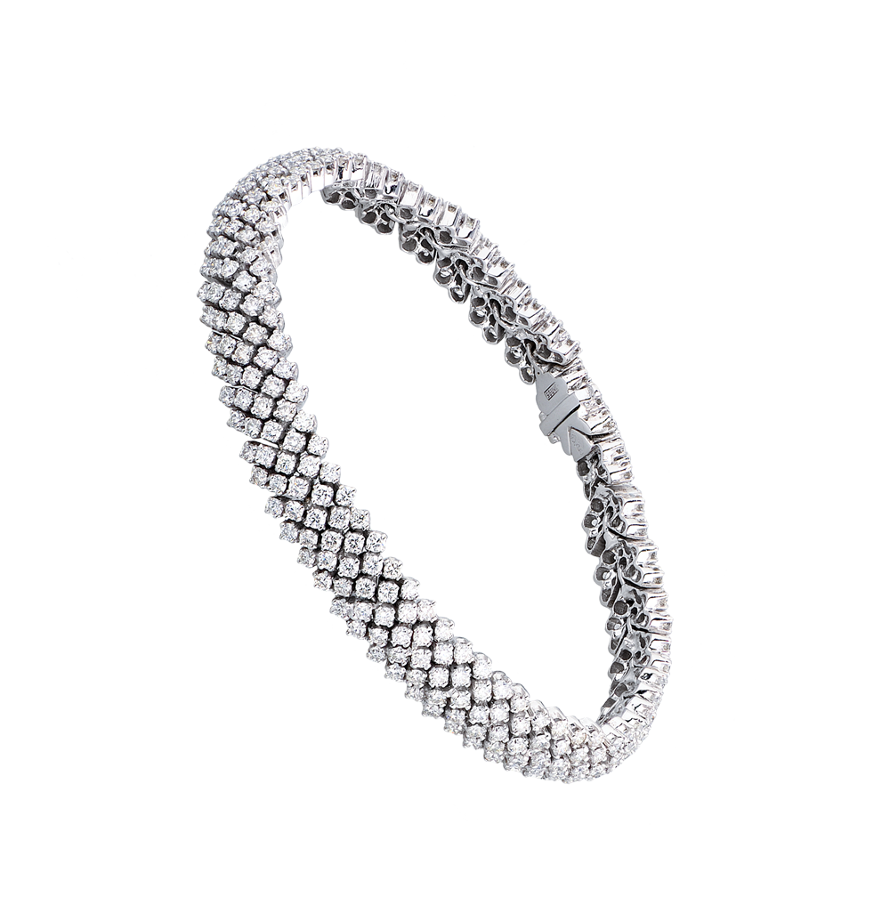 Браслет, выполненный из белого золота 750 пробы с бриллиантами классической огранки. 325 бриллиантов классической формы огранки общей массой 6,15 ct. Цвет 4-5 (J-L). Чистота 4-5 (VS1-SI1). Длина браслета - 16,5 см. Ширина - 7,5 мм. Вес - 21,10 гр. В комплекте прилагается экспертное заключение Геммологического центра МГУ.
