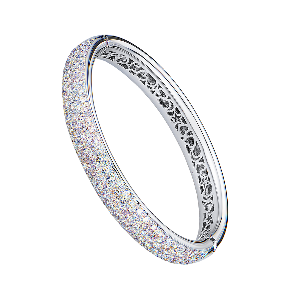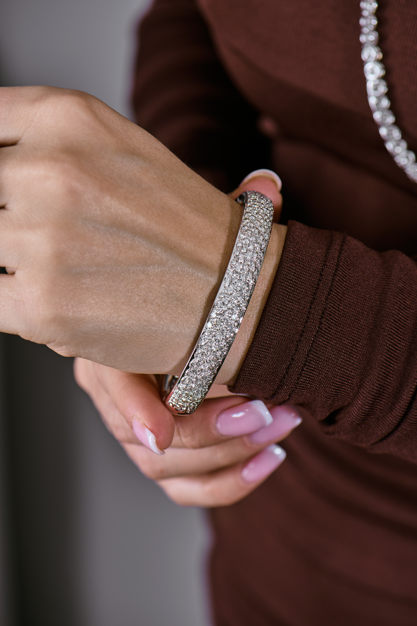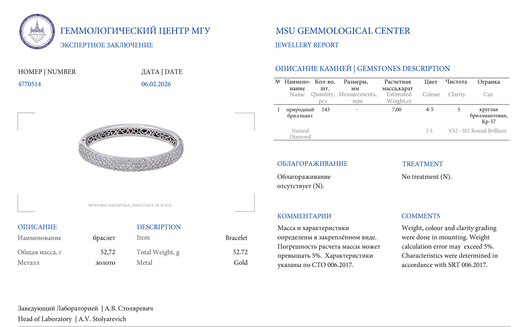 Браслет из белого золота 750 пробы с 143 бриллиантами классической формы огранки "Кр-57" общей массой 7,00 ct. Цвет бриллиантов 4-5 (J-L). Чистота бриллиантов 5 (VS2-SI1). Диаметр браслета 18,0 см. Ширина браслета - 10 мм. Вес - 52,72 гр. В комплекте экспертное заключение Геммологического центра МГУ.