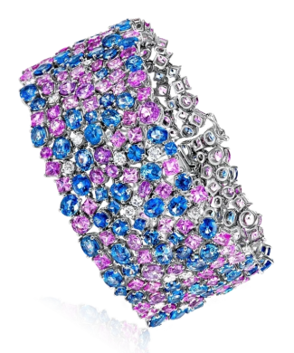 Браслет Yanush Gioielli выполненный из белого золота 750 пробы с сапфирами и бриллиантами. 182 розовых и 135 синих натуральных сапфира фантазийной формы огранки общей массой 79,95 ct. А также 35 бриллиантов классической формы огранки общей массой 1,54 ct. Ширина браслета - 30 мм. Размер браслета - 18,0 см. Вес - 91,66 гр. КОМЛЮ