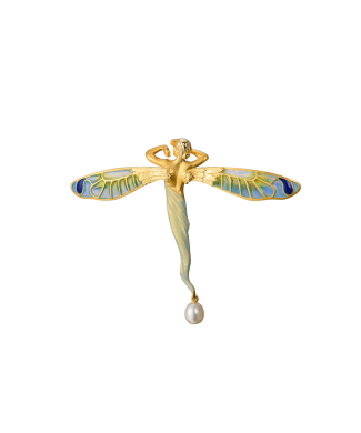 Брошь от культового бренда ювелирных изделий в стиле арт-нуво Masriera. Выполнена из желтого золота 750 пробы с одной жемчужиной и эмалью. Размер 75 х 50 мм. Вес - 17,51 гр.