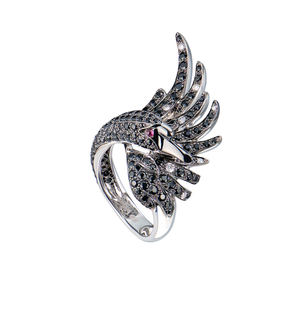 Одно кольцо выполнено из 174 черных сапфиров массой 3,62 карата, 9 бриллиантов 0,14 карат и двух рубинов 0,04 карата. Размер 17,0 (54). Вес - 13,74 гр.