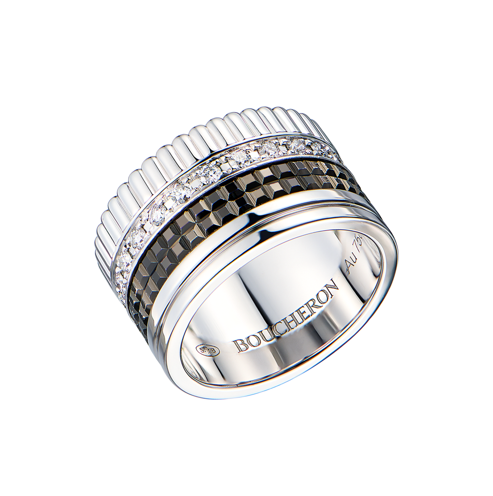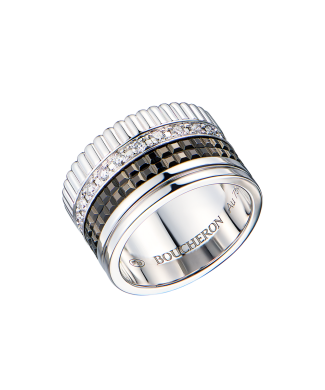 Кольцо Boucheron коллекции "Quatre Black Edition" выполненное из белого золота 750 пробы, PVD-покрытие с 25 бриллиантами общей массой 0,51ct. Размер 15,5 (49). Вес - 13,29 гр.