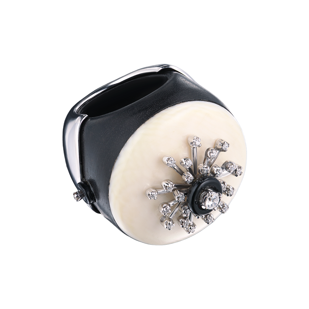 Кольцо выполненное в единственном экземпляре от ювелирного дома Burdi Creazioni, находящимся в Итальянском городе Бари. Изделие выполнено их белого золота 750 пробы, бриллиантов, оникса, слоновой кости и черного дерева. Вес золота - 15,70 гр. Масса бриллиантов - 0,42 ct Вес оникса, слоновой кости и черного дерева 18,51 гр. Размер - 17,5 (55). В комплекте оригинальные документы.
