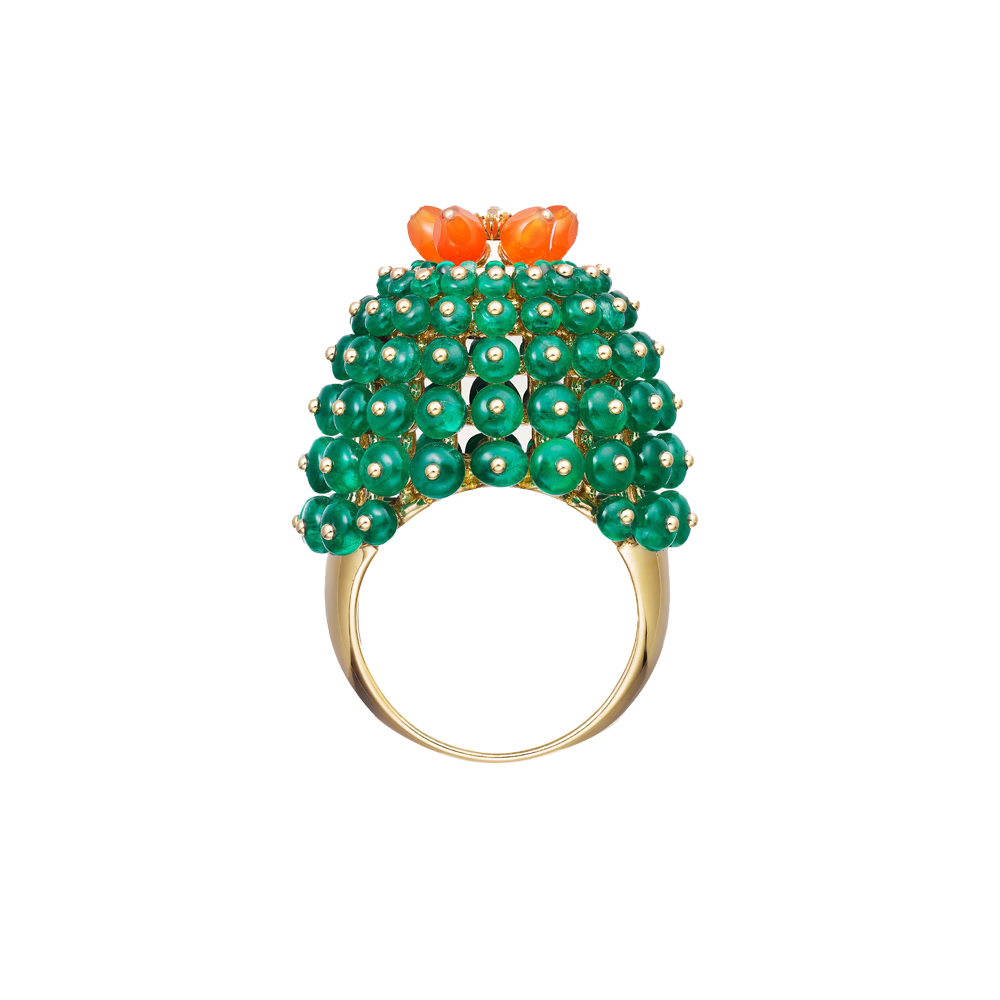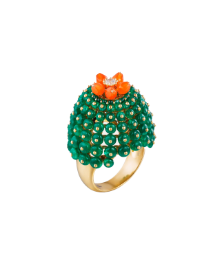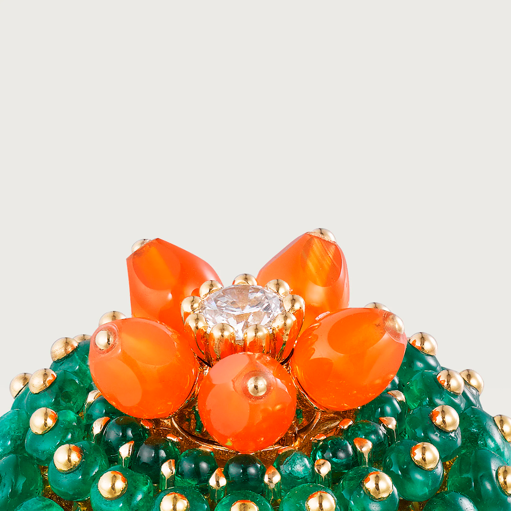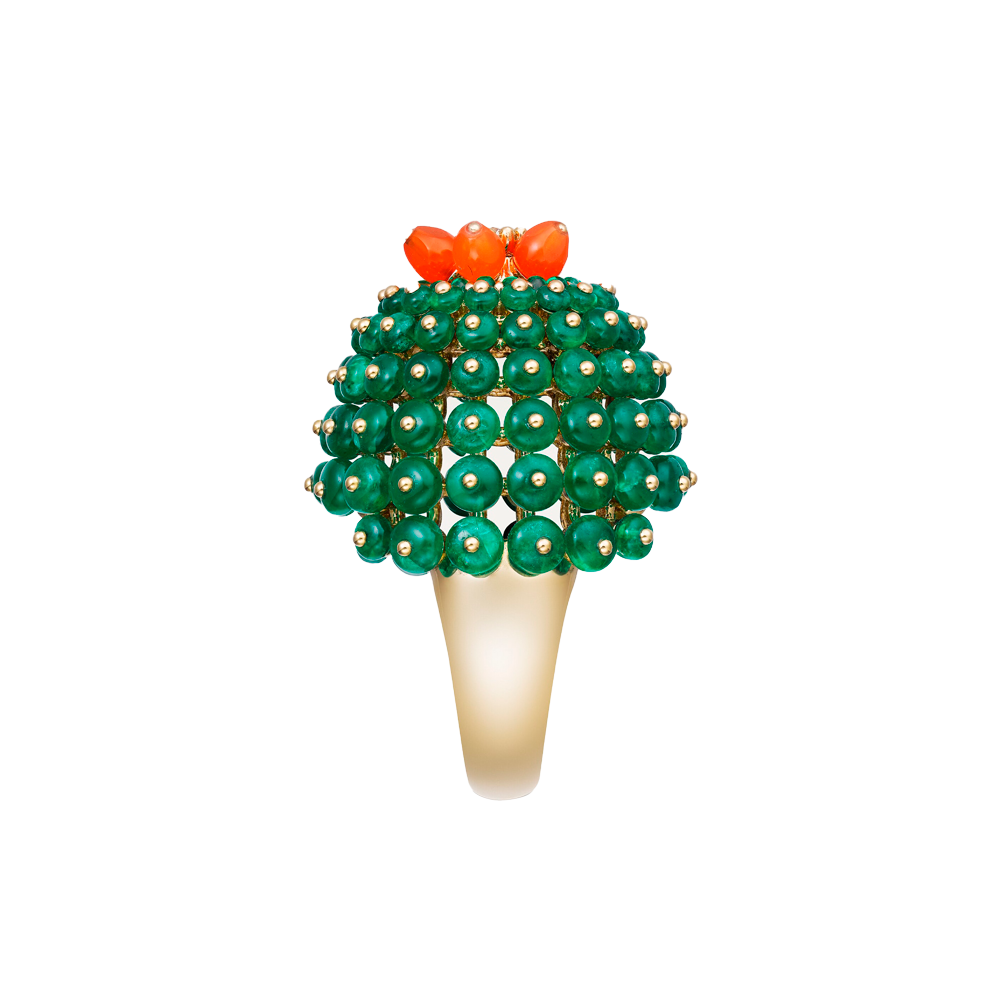 Коллекция Cactus de Cartier — это смелый дизайн, настоящий прорыв для Cartier, который ранее включал в свои украшения множество цветов, но никогда прежде не делал этого настолько неординарного. Это кольцо с изумрудными бусинами, имитирующими колючую кожуру кактуса-бочонка в полном расцвете, увенчанное оранжевыми цветами карнеола.