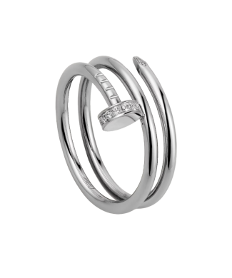 Кольцо Cartier коллекции "Juste Un Clou" в два витка выполненное из белого золота 750 пробы с 14 бриллиантами классической формы огранки общей массой 0,08 ct., ширина 1,8 мм. Размер кольца - 16,0 (50). Вес - 5,38 гр. Полный комплект!