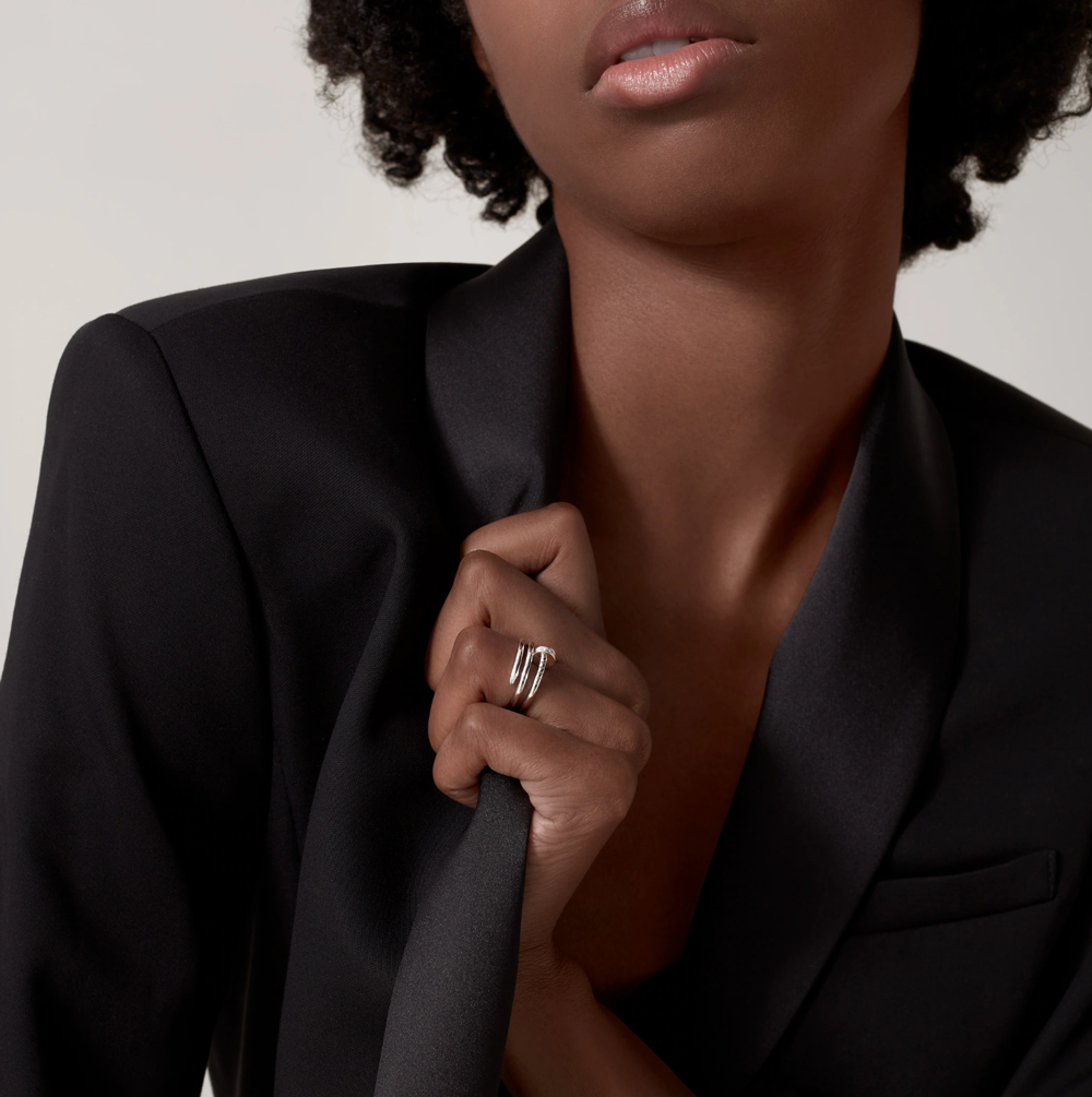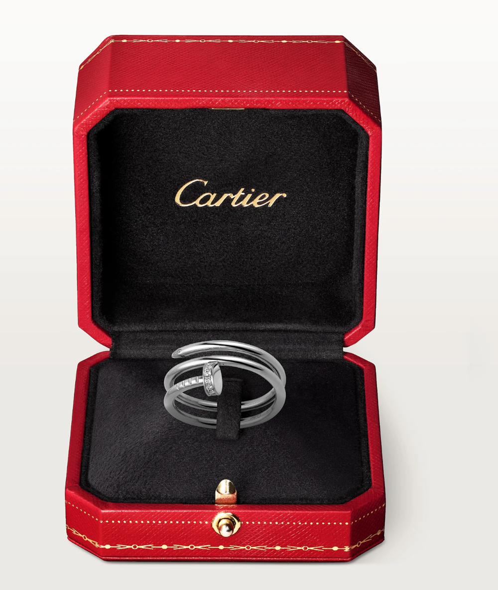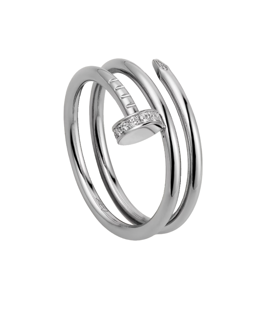 Кольцо Cartier коллекции "Juste Un Clou" в два витка выполненное из белого золота 750 пробы с 14 бриллиантами классической формы огранки общей массой 0,08 ct., ширина 1,8 мм. Размер кольца - 16,0 (50). Вес - 5,38 гр. Полный комплект!