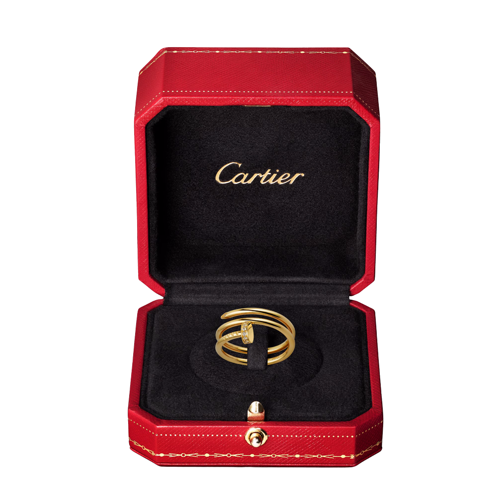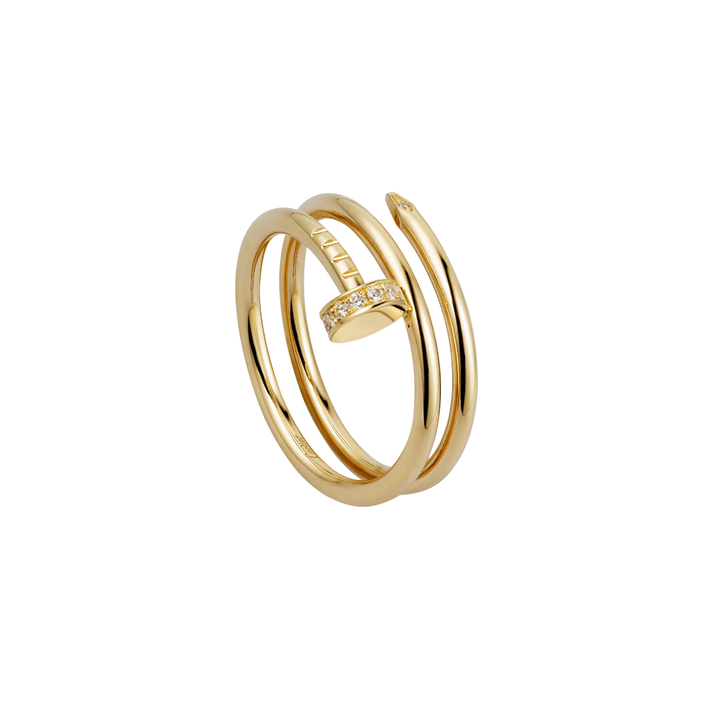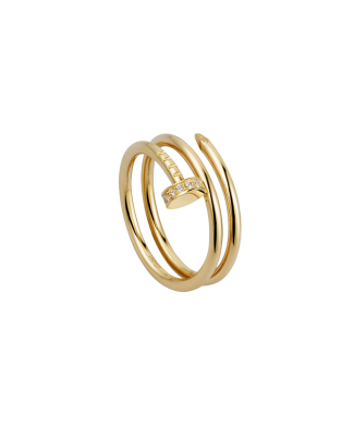 Кольцо Cartier коллекции "Juste Un Clou" в два витка выполненное из желтого золота 750 пробы с 14 бриллиантами классической формы огранки общей массой 0,08 ct., ширина 1,8 мм. Размер кольца - 16,0 (50). Вес - 5,32 гр.