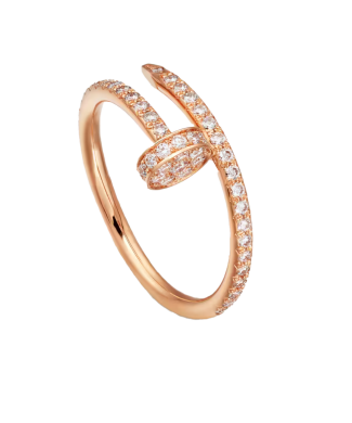 Кольцо Cartier коллекции "Juste Un Clou" выполненное из розового золота 750 пробы с 53 бриллиантами классической формы огранки общей массой 0,40 ct., маленькая модель. Размер кольца - 16,25 (51). Вес - 2,85 гр. Полный комплект!