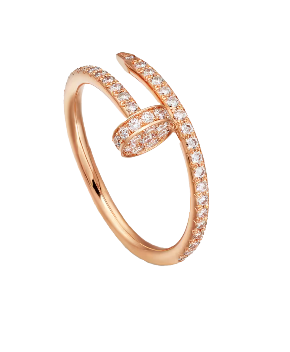Кольцо Cartier коллекции "Juste Un Clou" выполненное из розового золота 750 пробы с 53 бриллиантами классической формы огранки общей массой 0,40 ct., маленькая модель. Размер кольца - 16,25 (51). Вес - 2,85 гр. Полный комплект!