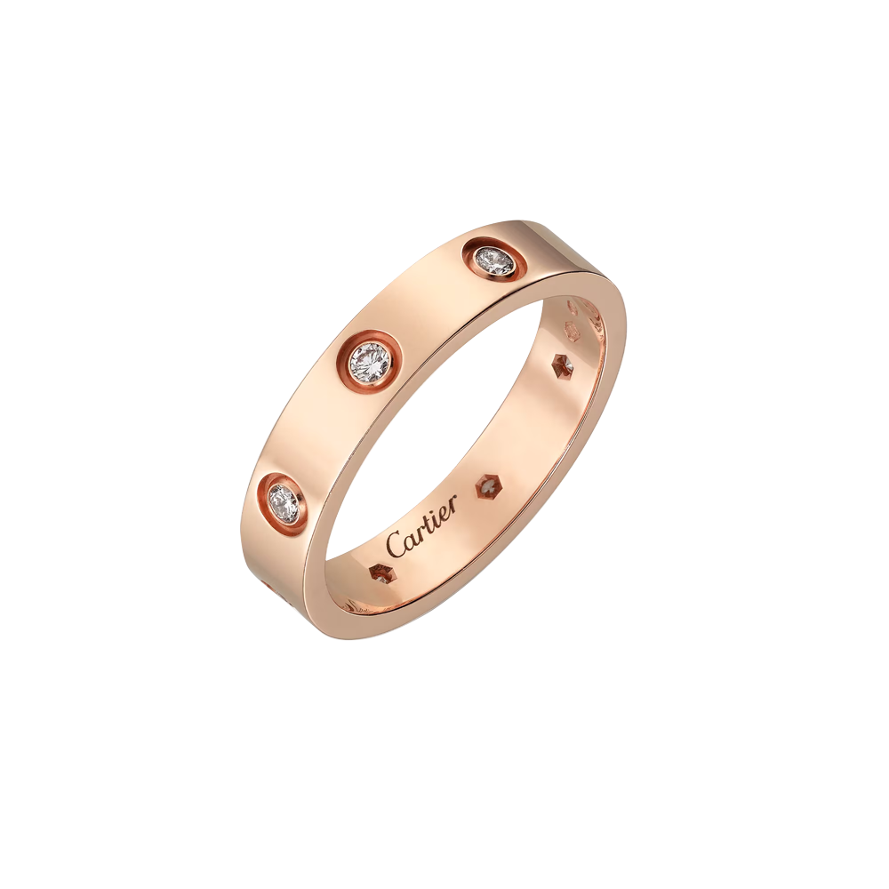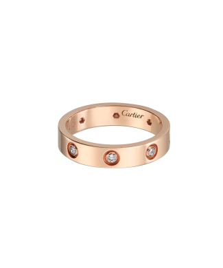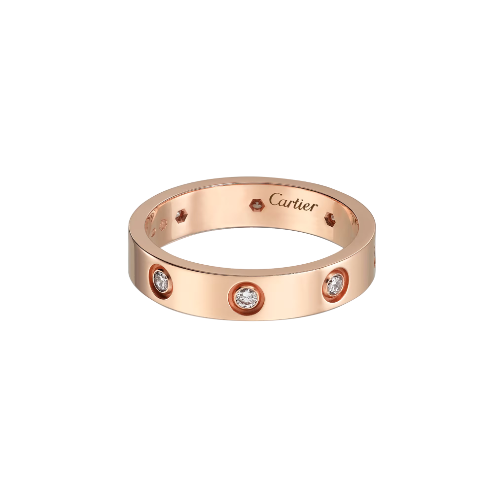 Кольцо Cartier коллекции "Love" выполненное из розового золота 750 пробы с 8 бриллиантами классической формы огранки массой 0,19 ct. Ширина 4 мм. Размер - 16,25 (51). Вес - 4,40 гр. Полный комплект!