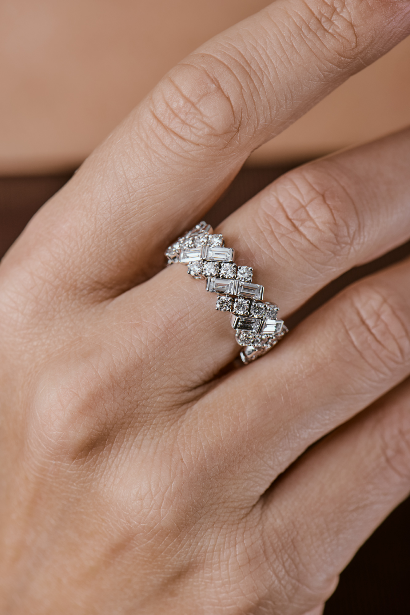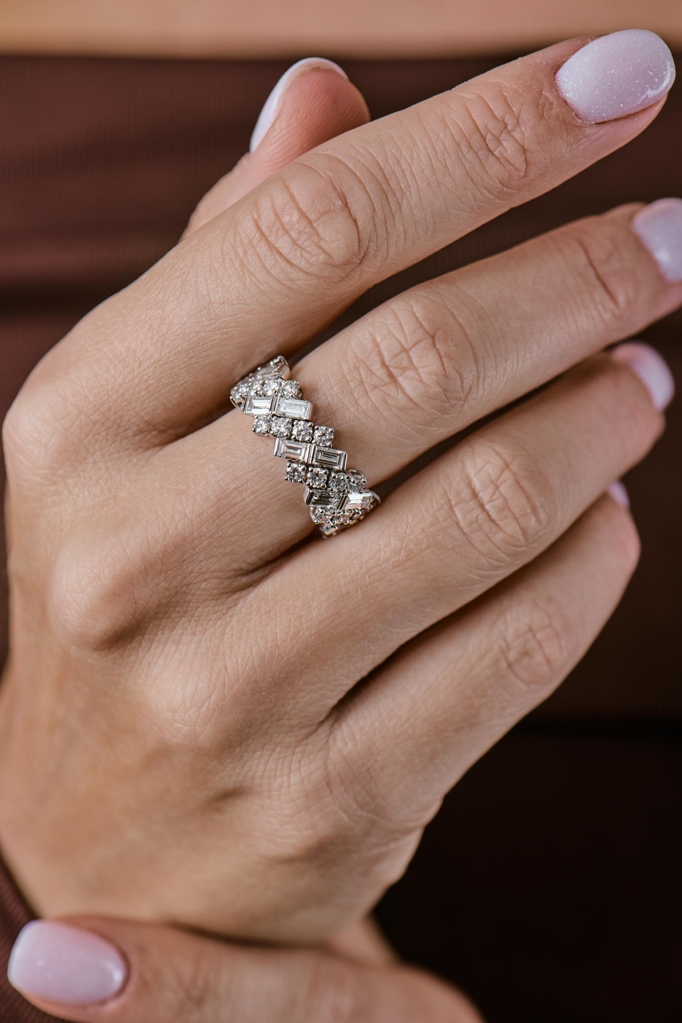 Обручальное кольцо Cartier коллекции "Reflection de Cartier" выполненное из белого золота 750 пробы с бриллиантами. 36 бриллиантов классической формы огранки общей массой 1,58 ct. G/VS1. 18 бриллиантов формы огранки "Багет" общей массой 1,94 ct. G/VS1. Размер кольца - 16,75 (53). Вес - 7,28 гр.
