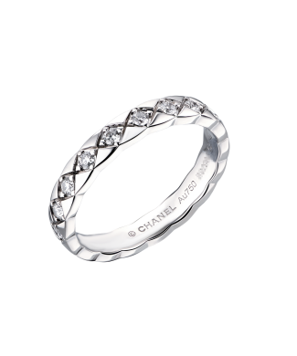 Кольцо Chanel коллекции "Coco Crush" модель маленького размера, выполненное из белого золота 750 пробы с 18 бриллиантами классической формы огранки общей массой 0,34 ct. Ширина 3,15 мм. Размер - 16,5 (52). Вес - 3,35 гр.