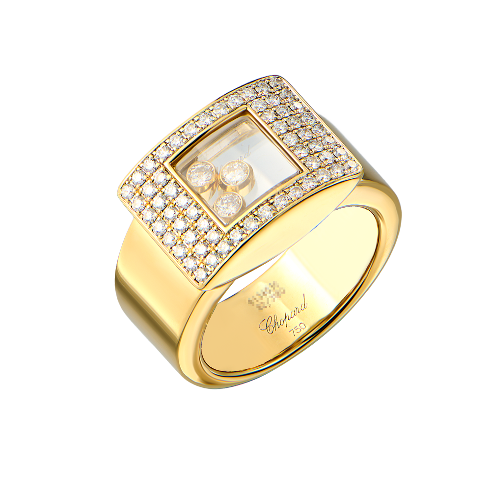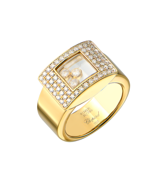 Кольцо Chopard "Happy Diamonds Happy Curves" выполненное из желтого золота 750 пробы с бриллиантами. 3 плавающих бриллианта массой 0,17 ct.60 бриллиантов классической формы огранки "Кр-57" массой 0,64 ct. Размер кольца - 18,0 (56). Вес - 18,45 гр.