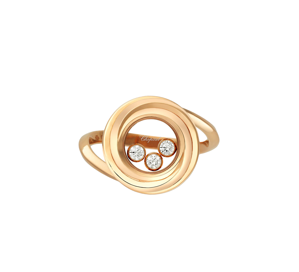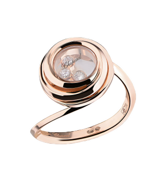 Кольцо Chopard коллекции "Happy Emotions" выполненное из розового золота 750 пробы с бриллиантами. 3 плавающих бриллианта общей массой 0,15 ct. Размер - 16,0 (50), Вес изделия - 6,40 гр. Полный комплект.