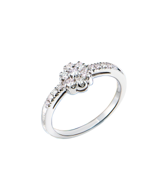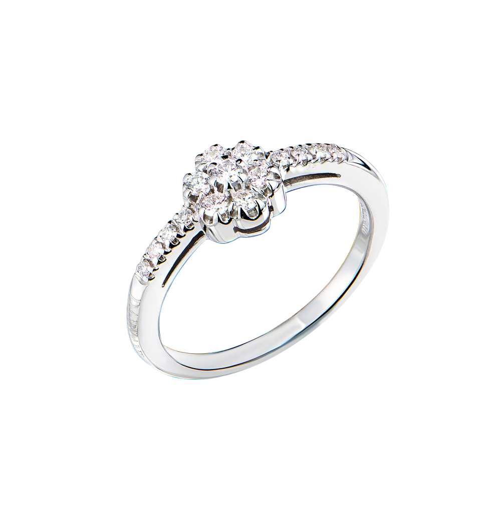 Кольцо Damiani выполненное из белого золота 750 пробы с 15 бриллиантами классической формы огранки "Кр-57" общей массой 0,26 ct. G-H/VS. Размер кольца - 17,5 (55). Вес - 3,33 гр.