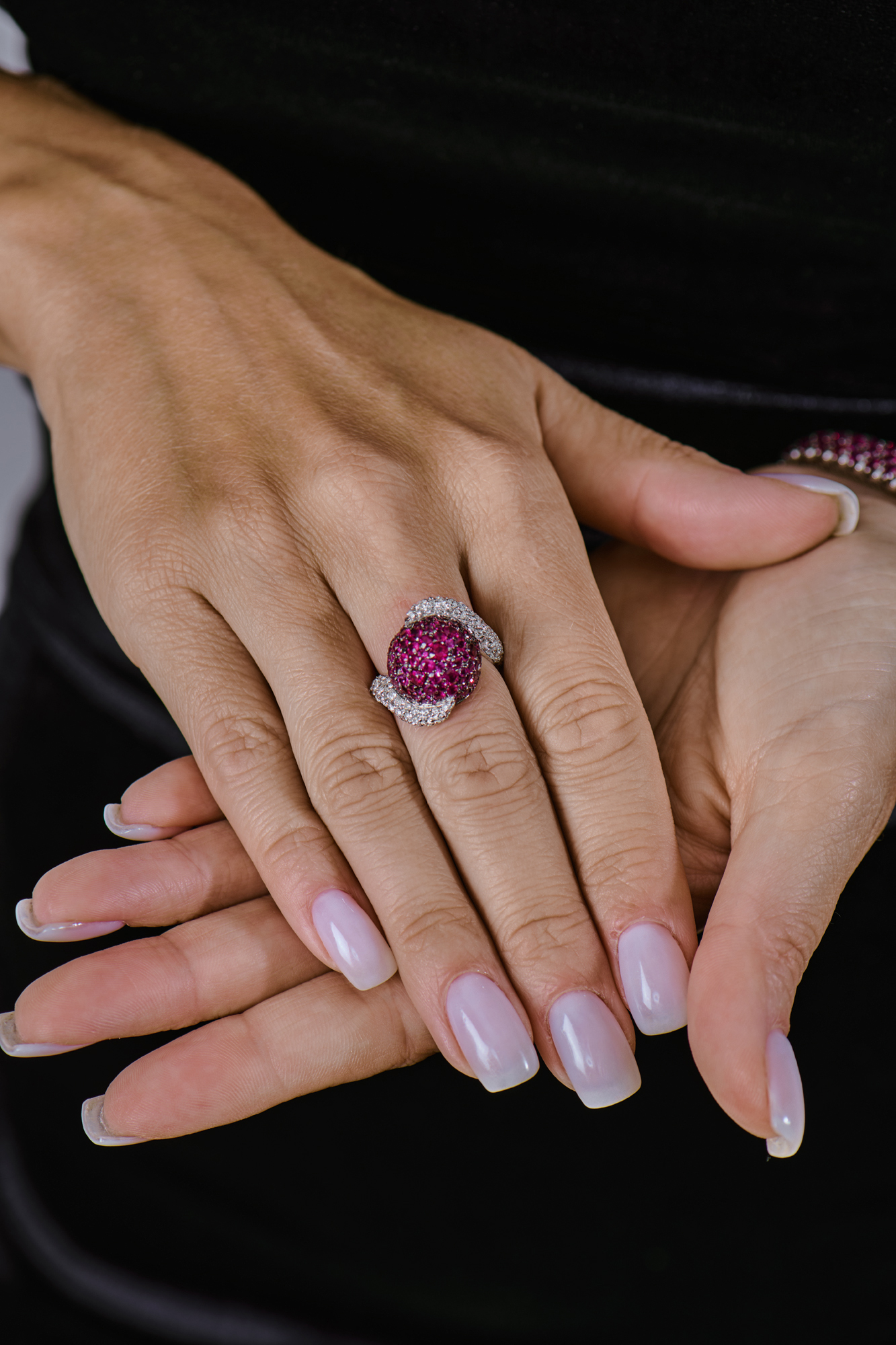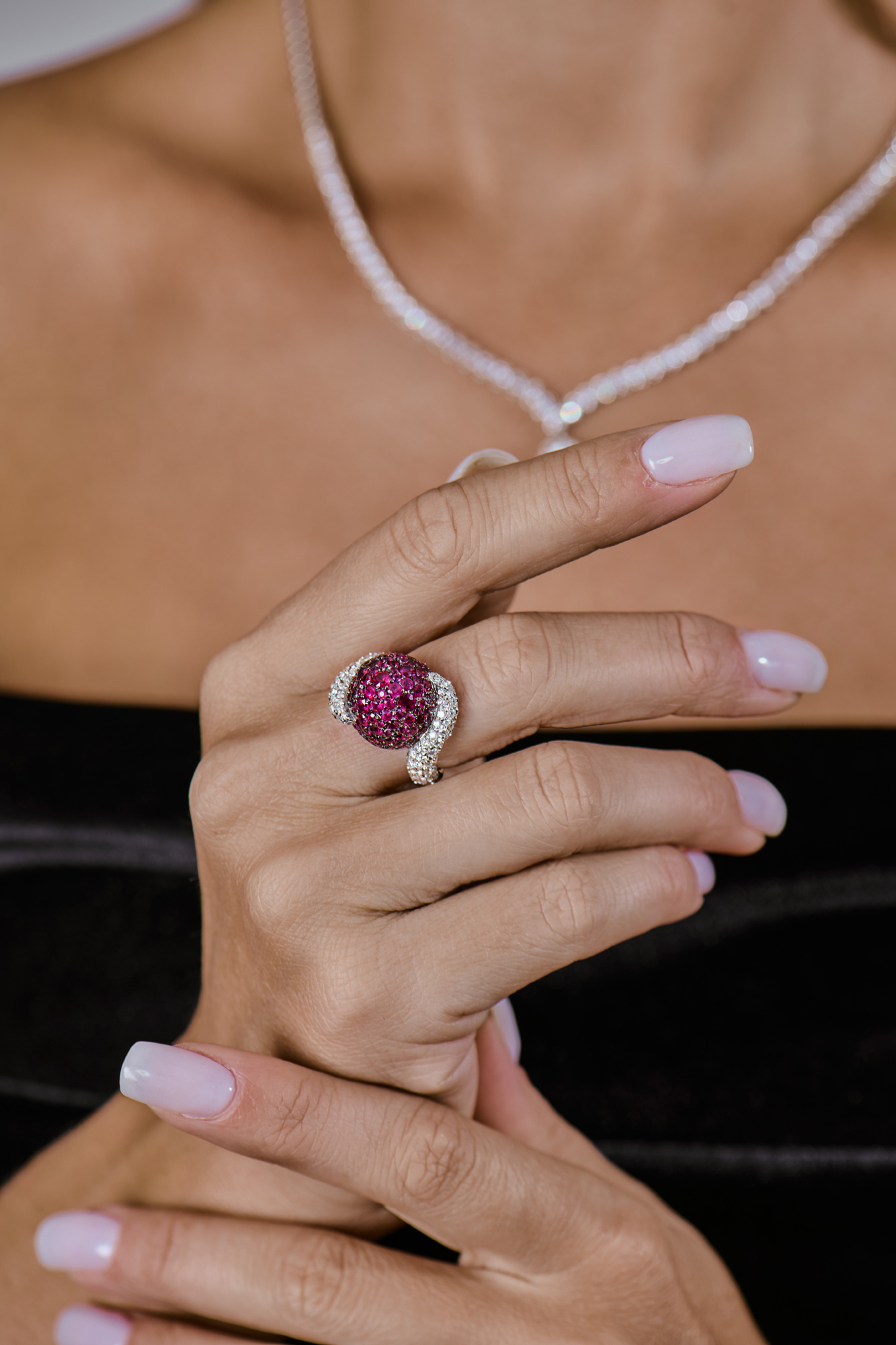 Кольцо De Grisogono коллекции "Boule" выполненное из белого золота 750 пробы с рубинами и бриллиантами классической формы огранки. Размер кольца - 17,0 (54). Вес - 10,34 гр.