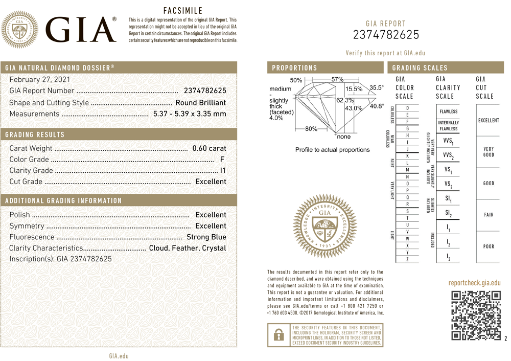 Кольцо выполненное из белого золота 585 пробы с бриллиантом классической формы огранки "Кр-57" массой 0,60 ct. Цвет - F. Чистота - I1. Размер кольца - 16,0 (50). Вес - 1,58 гр. В комплекте сертификат GIA (2374782625). Размер кольца можно изменить по вашему желанию.
