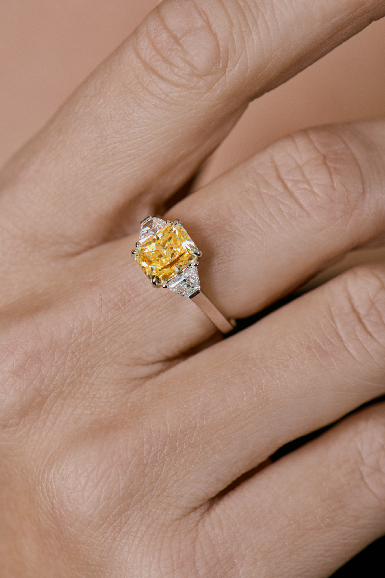 Кольцо, выполненное из белого золота 750 пробы с бриллиантами. Центральный бриллиант формы огранки "Радиант" массой 2,02 ct. Цвет - Natural Fancy Yellow. Чистота - SI2. В обрамлении 2 бриллианта формы огранки "Триллиант". Размер кольца - 16,50 (52). Вес - 3,58 гр. В комплекте прилагается сертификат GIA. Размер кольца можно изменить по вашему желанию.