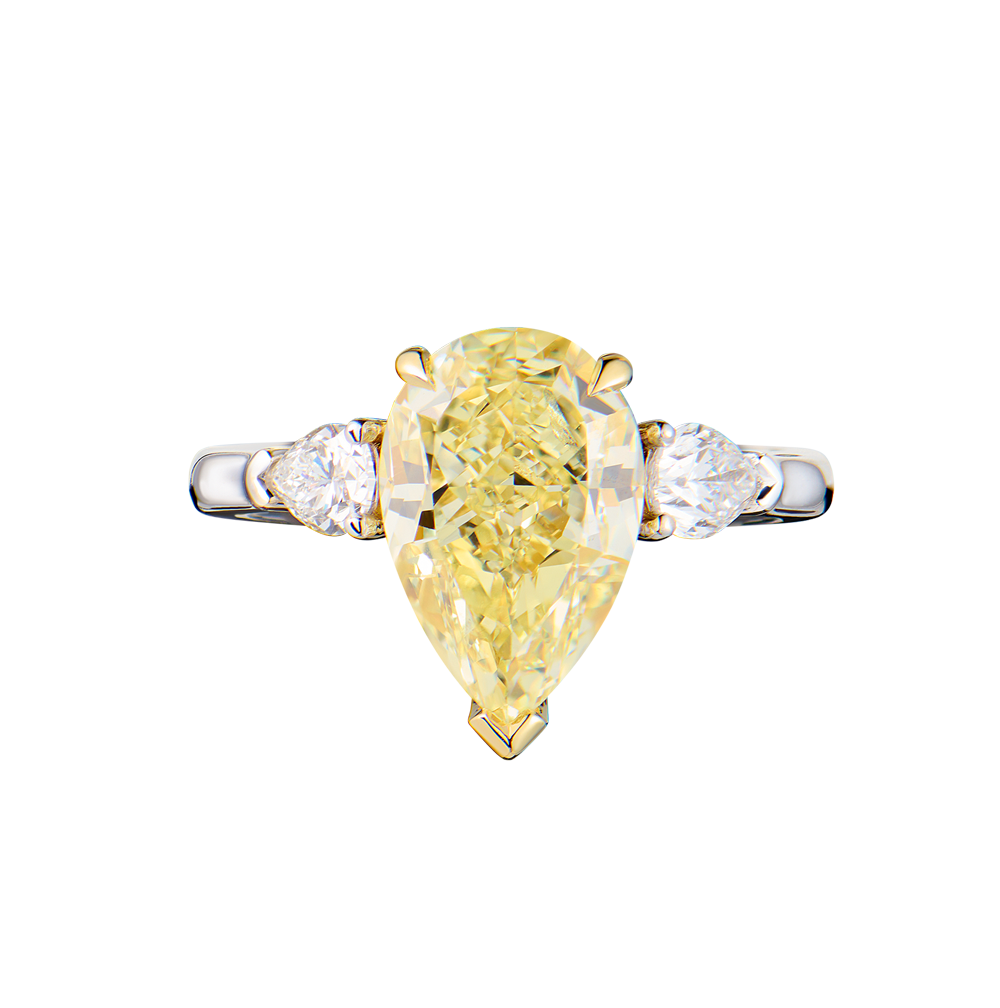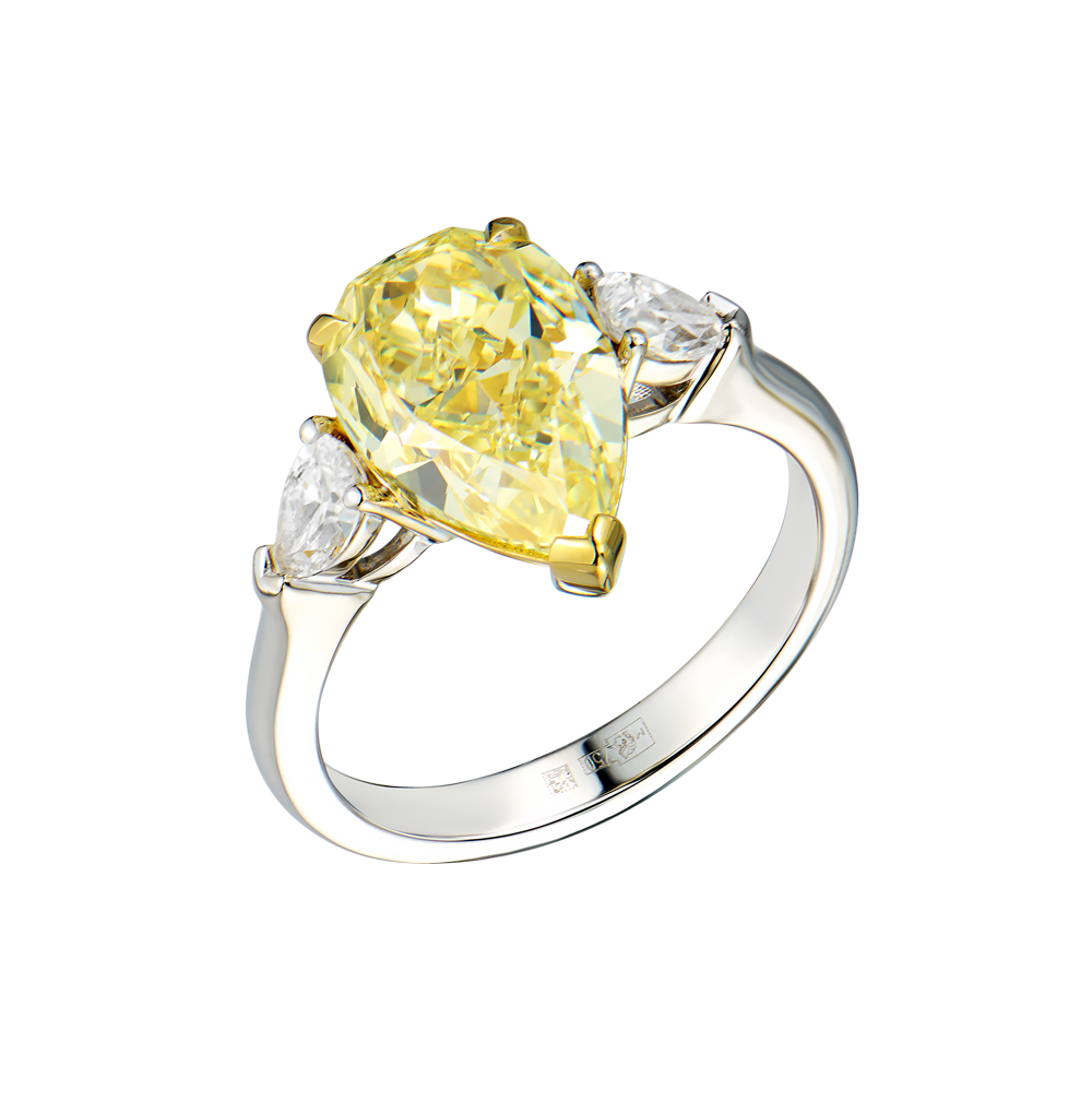 Кольцо, выполненное из белого и желтого золота 750 пробы с бриллиантами. Центральный бриллиант формы огранки "Груша" массой 4,02 ct. Цвет - Natural Fancy Yellow. Чистота - VS2. В обрамлении 2 бриллианта формы огранки "Груша" в обрамлении массой 0,45 ct. Размер кольца - 17,0 (54). Вес - 5,65 гр. В комплекте прилагается сертификат GIA. Размер кольца можно изменить по вашему желанию.