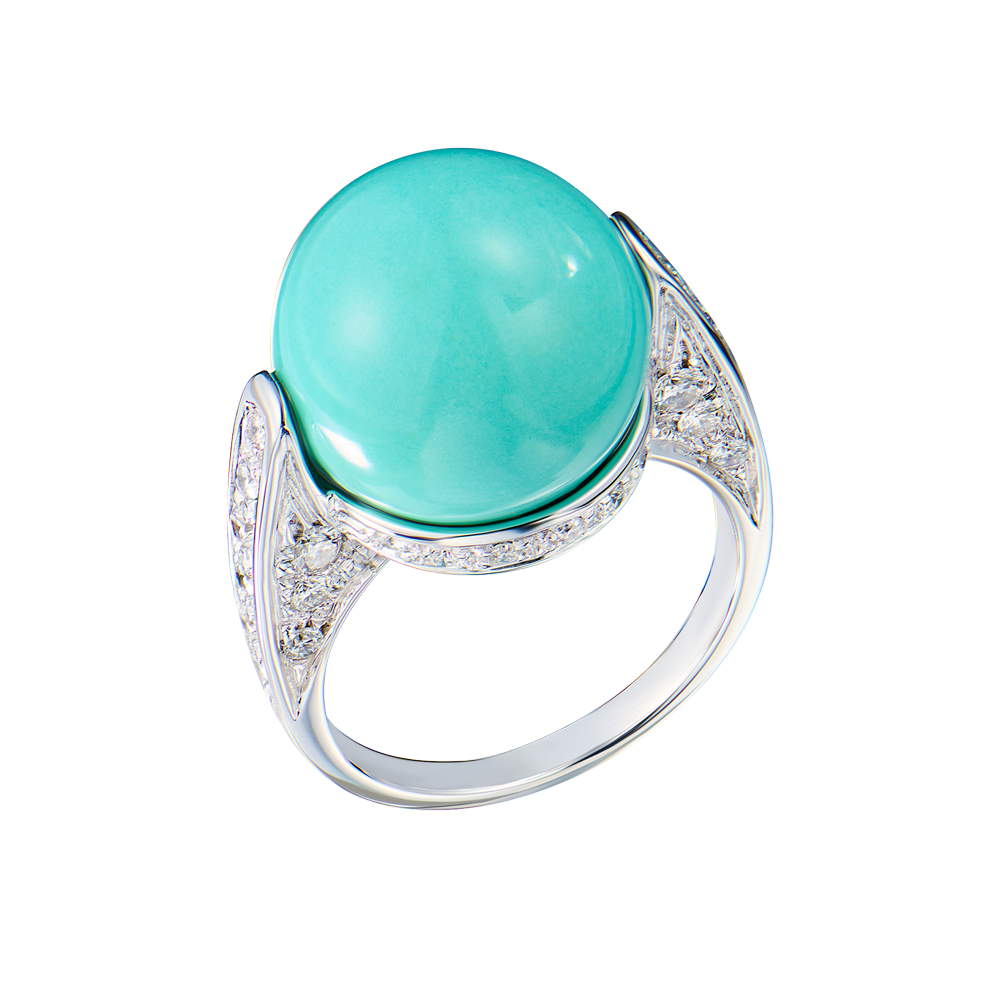 Кольцо Giancarlo Gioielli выполненное из белого золота 750 пробы с вставками из 38 природных бриллиантов классической формы огранки общей массой 0,5 ct и бирюзой. Размер кольца - 17,0 (54). Вес - 11,17 гр.