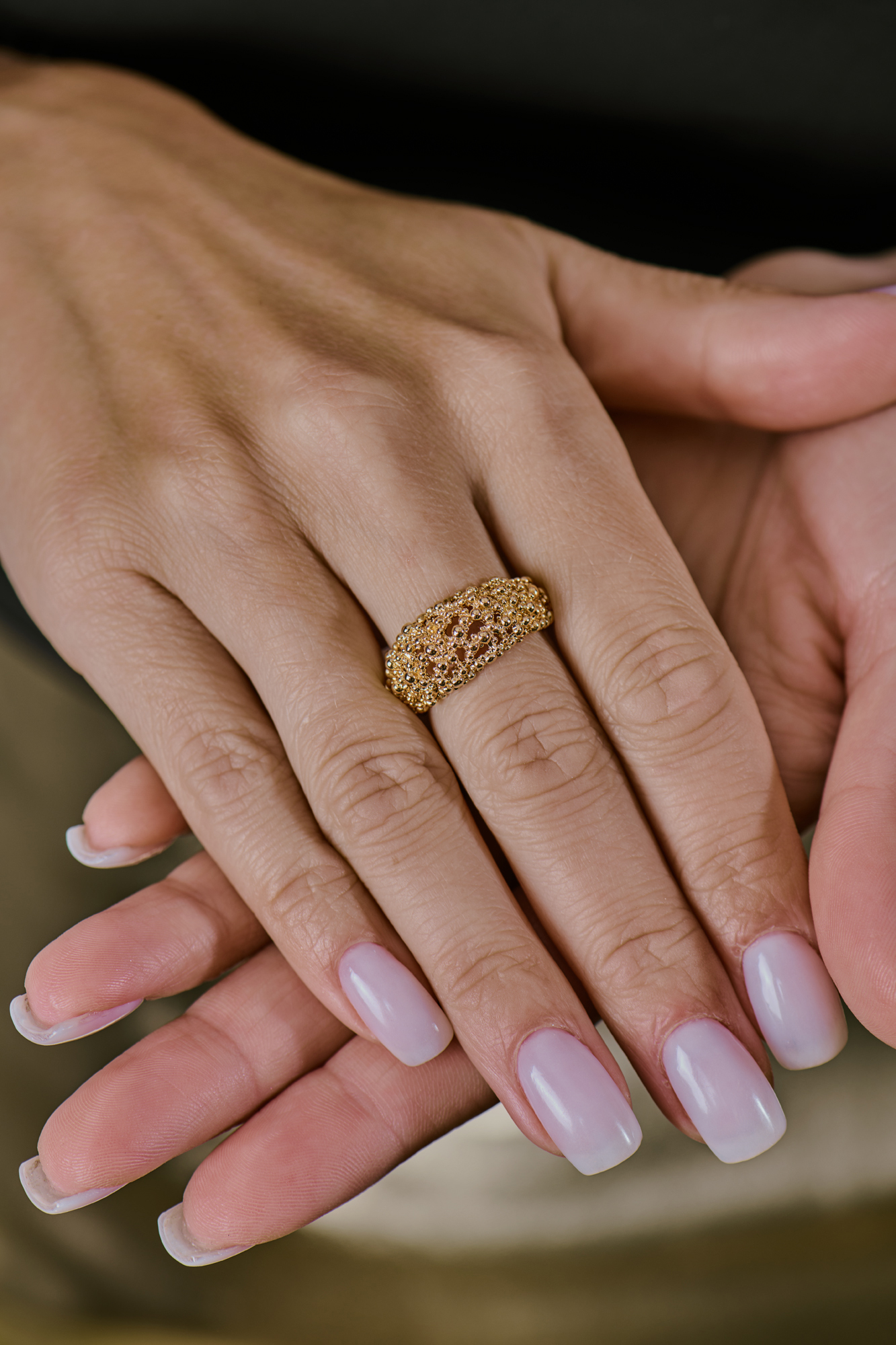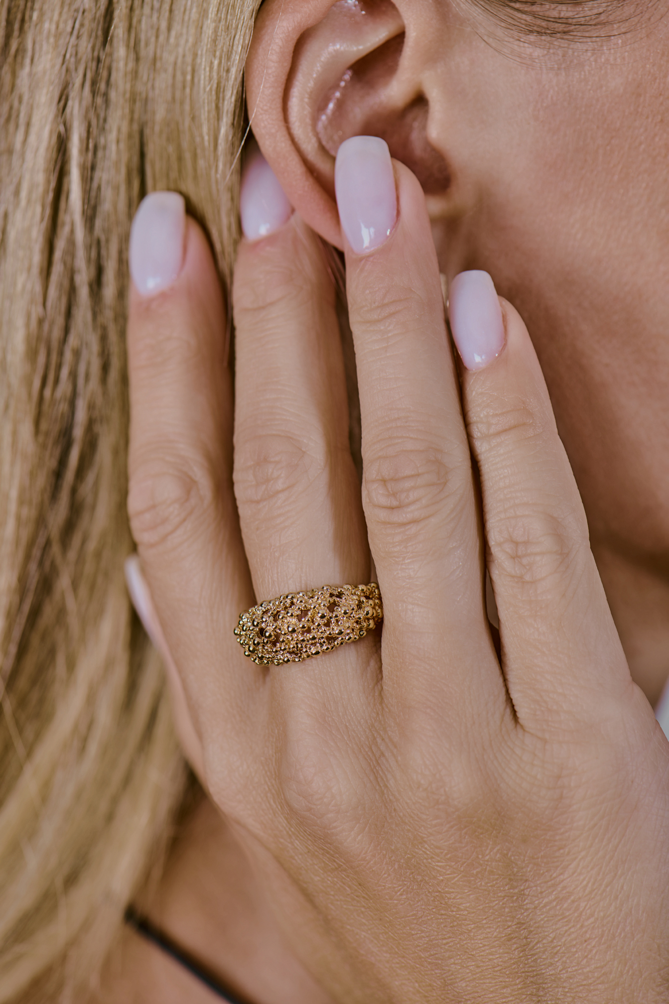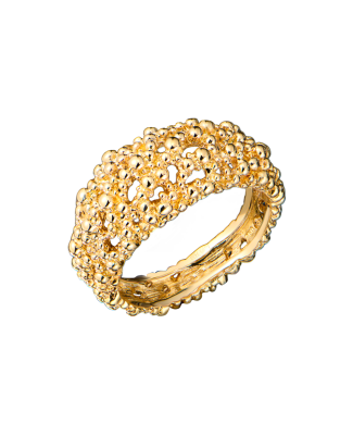 Кольцо от легендарного швейцарского ювелира Гилберта Альберта из желтого золота 750 пробы, выполненные из агломерата золотых бусин. Размер 17,5 (55). Вес - 8,78 гр. Украшение выполнено в единственном экземпляре.