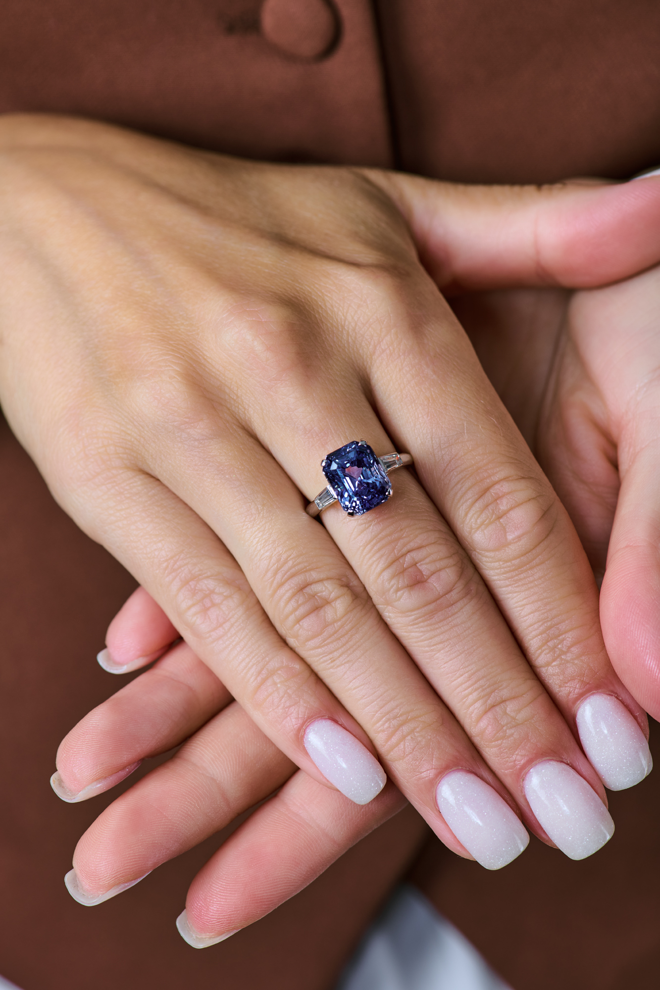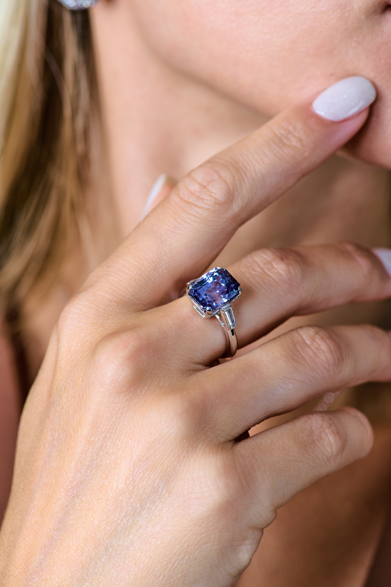 Кольцо выполненное из белого золота 750 пробы с бриллиантами и сапфиром. 1 природный сапфир место происхождения Шри Ланка 8,90 ct. Цвет Pastel Blue. Формы огранки "Октагон". В обрамлении 2 бриллиантов формы огранки "Трапециевидный багет" общей массой 0,20 ct. Размер 16,5 (52). Вес - 5,68 гр. В комплекте прилагаются сертификаты GRS Gemresearch Swisslab.