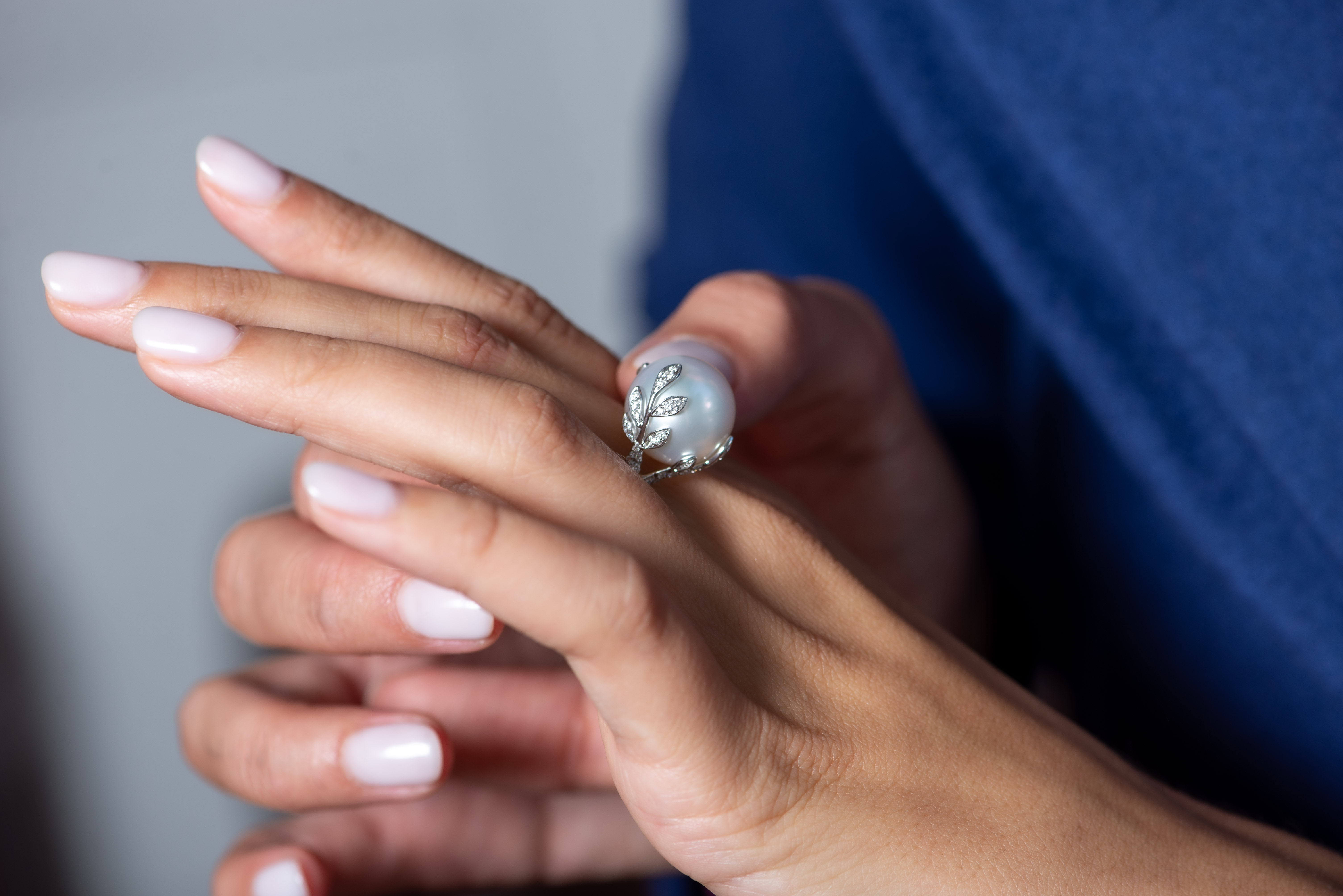 Кольцо Mikimoto коллекции "Olive Branch" выполненное из белого золота 750 пробы, жемчужины Akoya диаметром 14,5 мм., паве бриллиантов классической формы огранки общей массой 0,68 ct. Размер кольца - 16,75 (53). Вес - 9,77 гр.