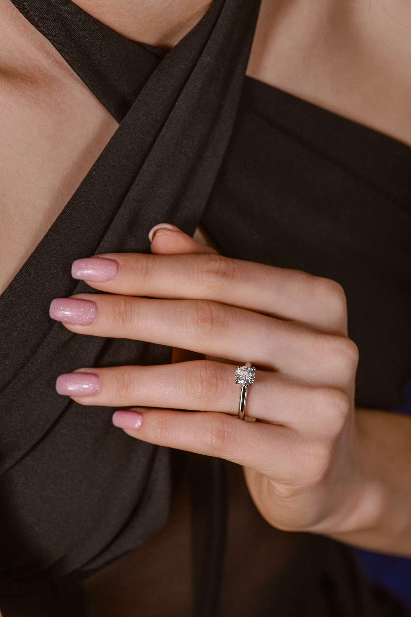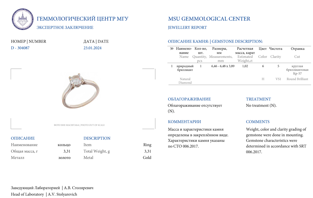 Кольцо, выполненное из белого золота 750 пробы с бриллиантом классической формы огранки "Кр-57" массой 1,02 ct. Цвет - H. Чистота - VS1. Размер кольца - 16,75 (53). Вес - 3,19 гр. Размер кольца можно изменить по Вашему желанию. В комплекте прилагается экспертное заключение Геммологического центра МГУ.