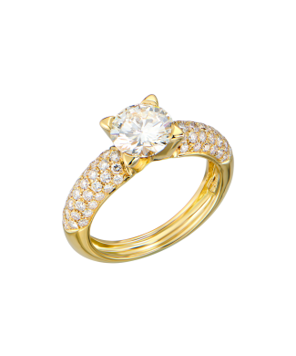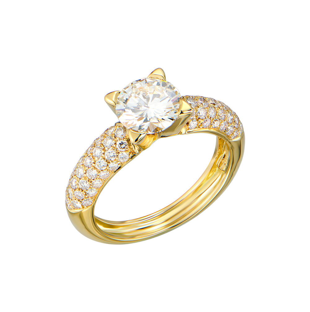 Кольцо, выполненное из желтого золота 750 пробы с бриллиантом классической формы огранки "Кр-57" массой 1,50 ct. Цвет H. Чистота VS2. 68 бриллиантов классической формы огранки в обрамлении общей массой 0,58 ct. Размер кольца - 17,5 (55). Вес - 5,25 гр. В комплекте прилагается экспертное заключение Геммологического Центра МГУ. Размер кольца можно изменить по Вашему желанию.