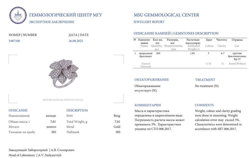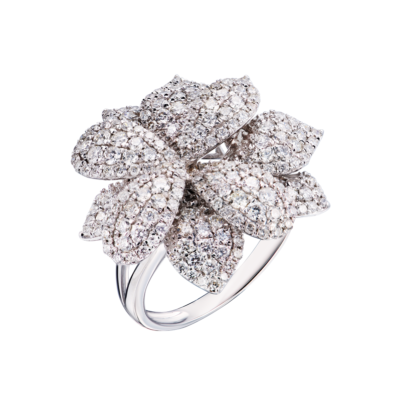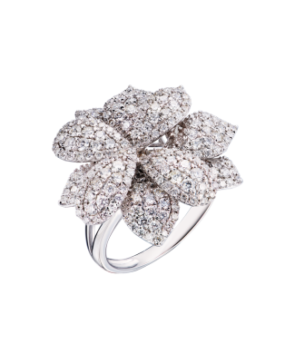 Кольцо выполненное из белого золота 585 пробы с бриллиантами. 209 бриллиантов формы огранки "Кр-57" общей массой 1,82 сt. Цвет - 3 (G-H). Чистота 6-7 (I1). Диаметр цветка - 25 мм. Размер кольца - 17,75 (56). Вес - 7,61 гр. В комплекте прилагается экспертное заключение Геммологического центра МГУ.