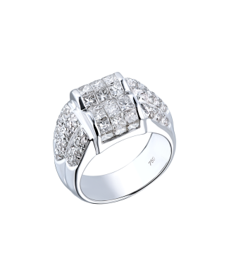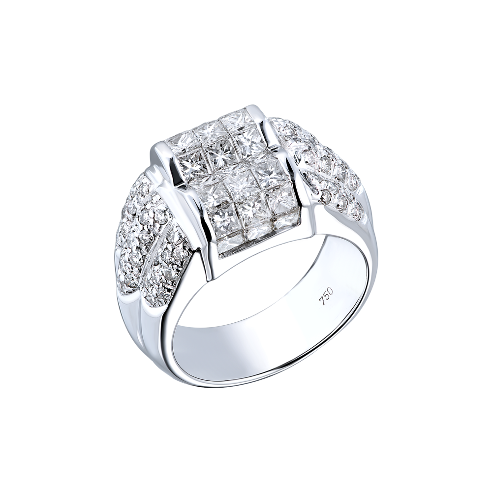 Кольцо выполненное из белого золота 750 пробы с бриллиантами фантазийной и классической формы огранки общей массой 2,25 ct. 24 бриллиантов форма огранки "Принцесса" общей массой 1,80 ct. Цвет - 3 (G-H). Чистота 4-5 (VS2-SI1). 60 бриллиантов формы огранки "Кр-57" общей массой 0,45 сt. Цвет - 3 (G-H). Чистота 4-5 (VS2-SI1). Ширина кольца - 11,0 мм. Размер кольца - 17,0 (54). Вес - 12,03 гр. В комплекте прилагается экспертное заключение Геммологического центра МГУ.