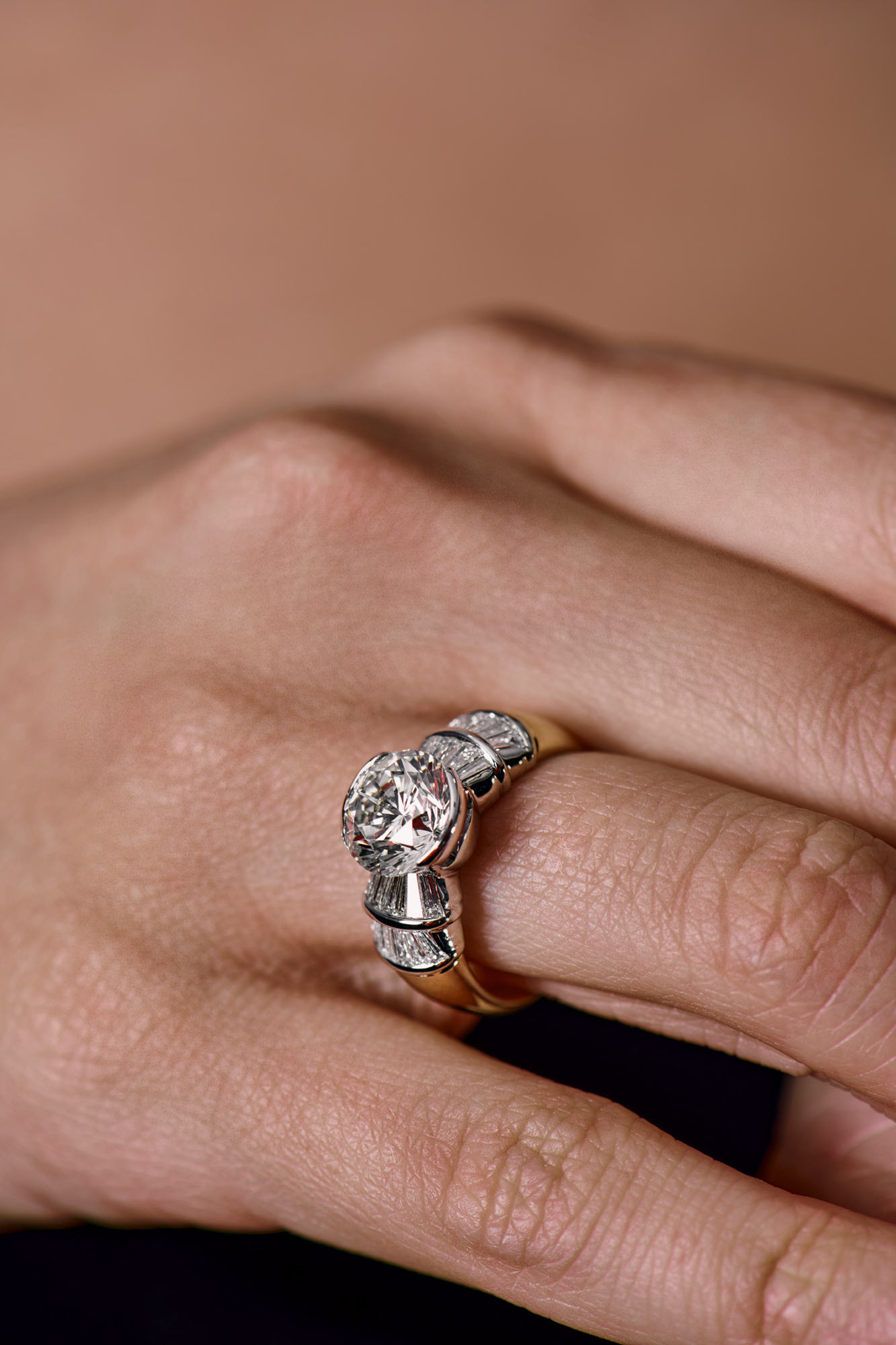 Кольцо, выполненное из желтого и белого золота 750 пробы с бриллиантами. Центральный бриллиант классической формы огранки "Кр-57" массой 2,93 ct. Цвет - H. Чистота - VS2. В обрамлении 24 бриллианта формы огранки "Трапеция" общей массой 0,46 ct. Размер кольца - 17,0 (54). Вес - 8,27 гр. В комплекте прилагается экспертное заключение Геммологического Центра МГУ. Размер кольца можно изменить по Вашему желанию.