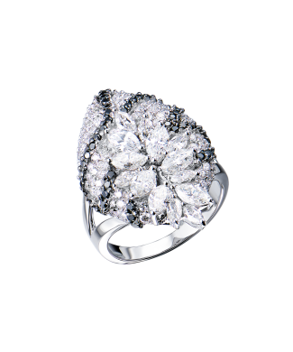 Кольцо выполненное из белого золота 750 пробы с белыми и черными бриллиантами. 98 бриллиантов классической формы огранки общей массой 1,55 ct, 14 бриллиантов формы огранки "Маркиз" общей массой 2,00 ct., и 51 черными бриллиантами классической формы огранки общей массой 0,40 ct. Размер кольца - 19,0 (60). Диаметр 30 х 20 мм. Вес - 15,13 гр. В комплекте прилагается экспертное заключение Геммологического центра МГУ.