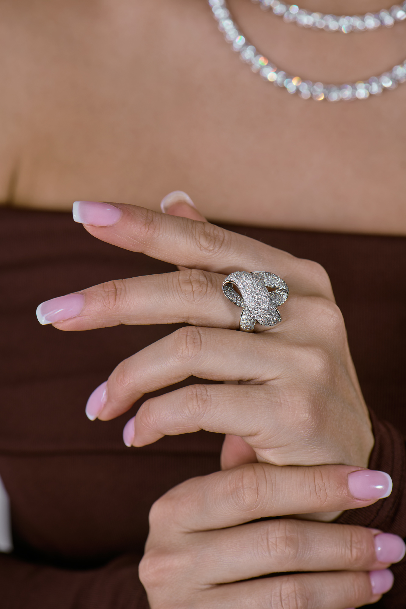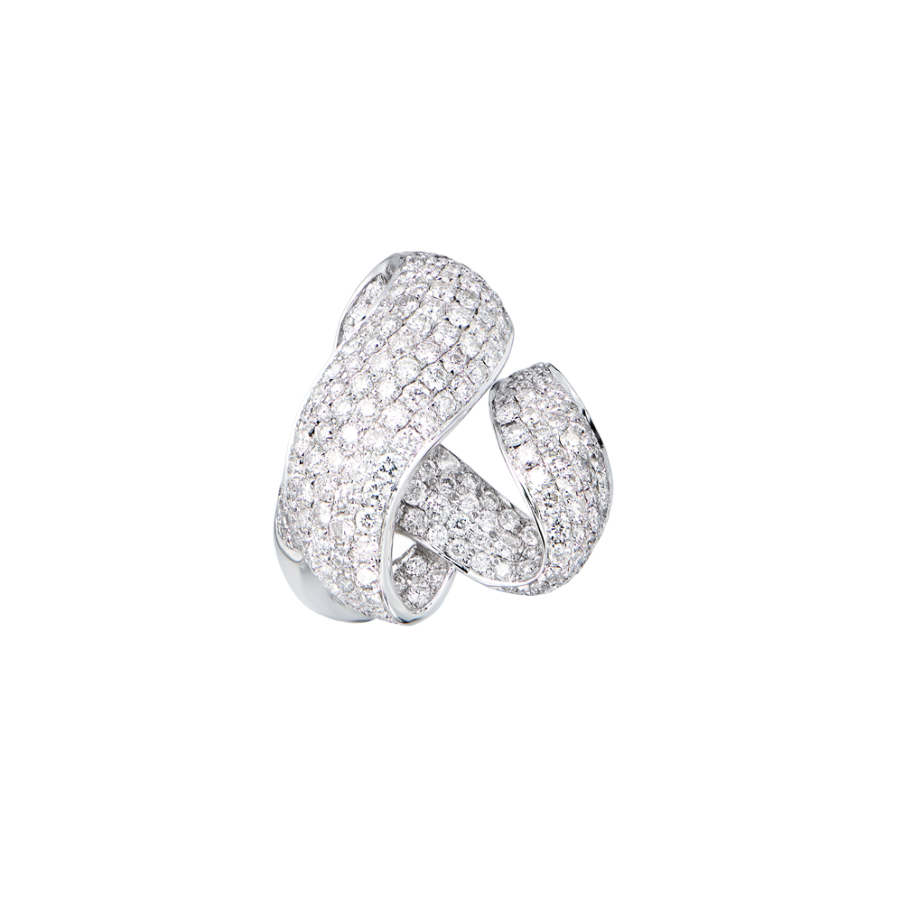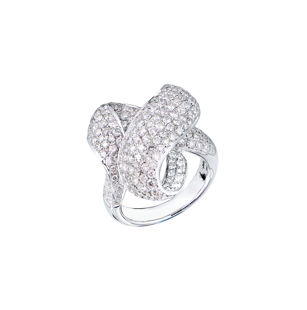 Кольцо выполненное из белого золота 750 пробы с 236 бриллиантами классической формы огранки "Кр-57", общей массой 3,60 ct. Цвет 3 (G-H). Чистота 6-7. Размер кольца - 16,5 (52). Вес - 11,40 гр. В комплекте прилагается экспертное заключение Геммологического центра МГУ.