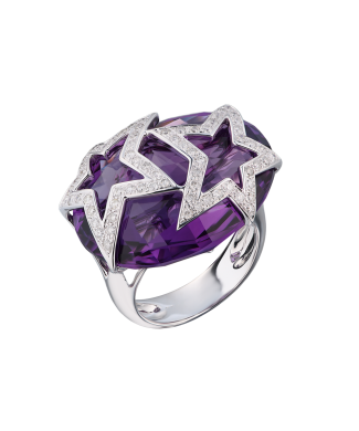 Кольцо выполненное из белого золота 750 пробы. 1 природный аметист. 72 бриллианта классической формы огранки общей массой 0,21 ct. Размер кольца - 17,0 (54). Вес - 16,17 гр.
