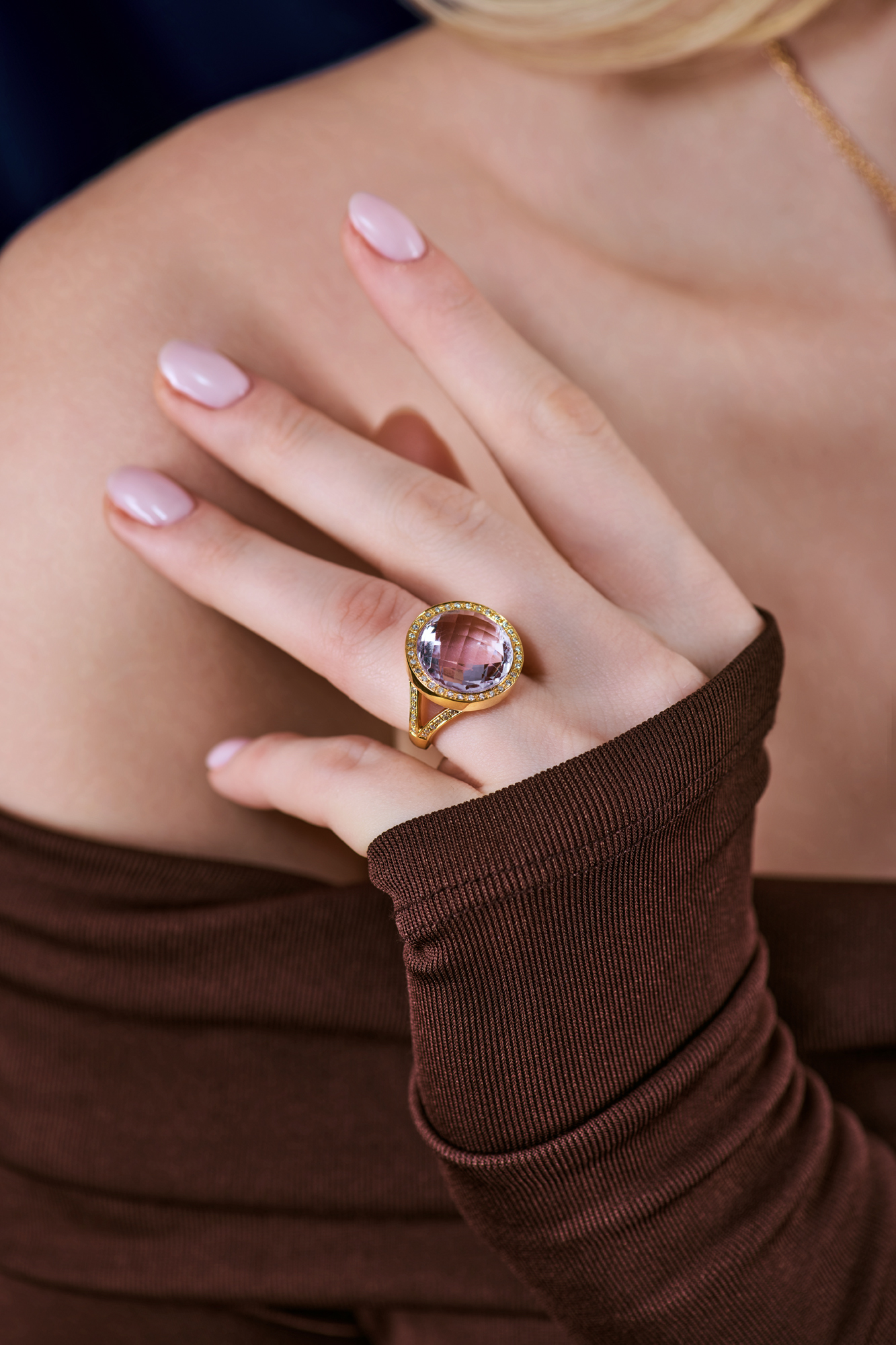 Кольцо выполненное из желтого золота 750 пробы с аметистом 12,5 ct., и 32 бриллиантами классической формы огранки общей массой 0,16 ct. Размер - 16,25 (51). Вес - 10,83 гр.
