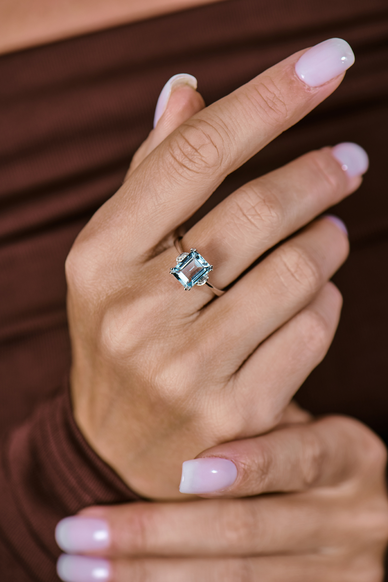 Кольцо выполненное из белого золота 750 пробы с вставкой из топаза формы огранки "Изумруд" общей массой 2,25 ct.. а также с 4 бриллиантами классической формы огранки массой 0,01 ct.Размер - 17,75 (56). Вес - 4,64 гр.