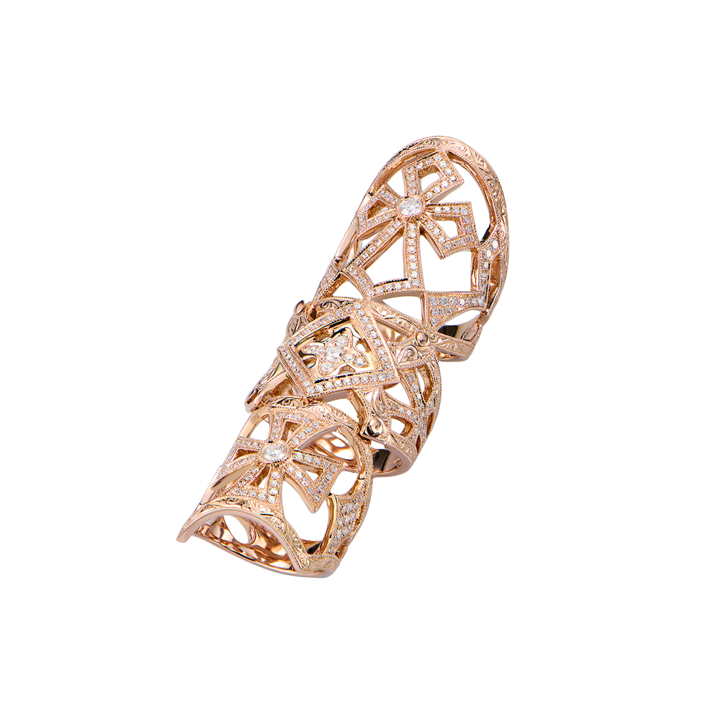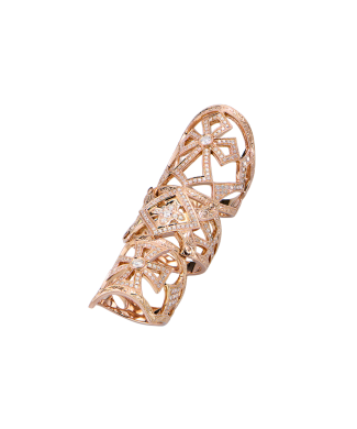 Кольцо на весь палец выполненное из розового золота 750 пробы с 253 бриллиантами классической формы огранки общей массой 0,95 ct. Размер кольца - 17,5 (55) и 15,0 (47). Вес - 28,12 гр.