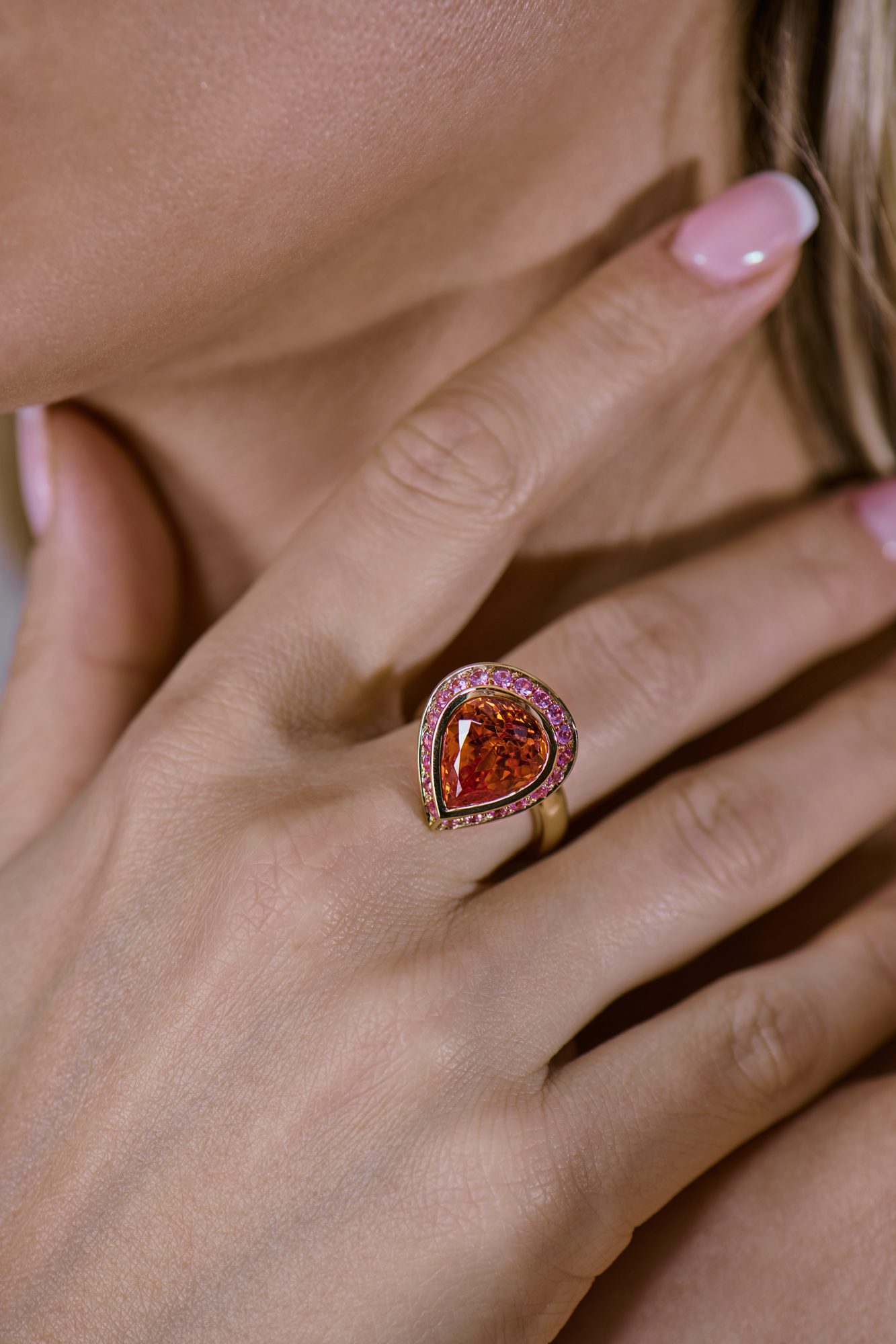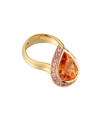 Кольцо выполненное из желтого золота 750 пробы с цитрином массой 6,3 ct., формы огранки "Груша" в обрамлении 20 розовых топазов классической формы огранки. Размер кольца - 17,0 (54). Вес - 14,39 гр.