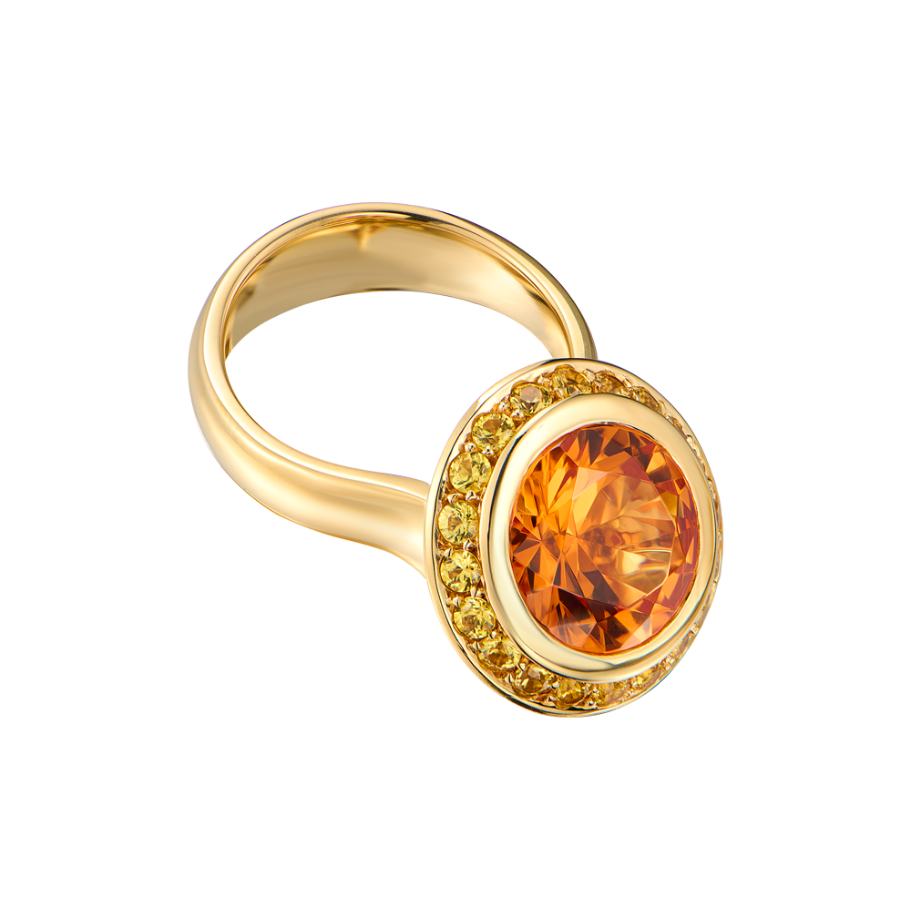 Кольцо выполненное из желтого золота 750 пробы с цитрином массой 4.9 ct., формы огранки "Круг" в обрамлении 20 топазов классической формы огранки. Размер кольца - 16,75 (53). Вес - 14,23 гр.